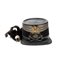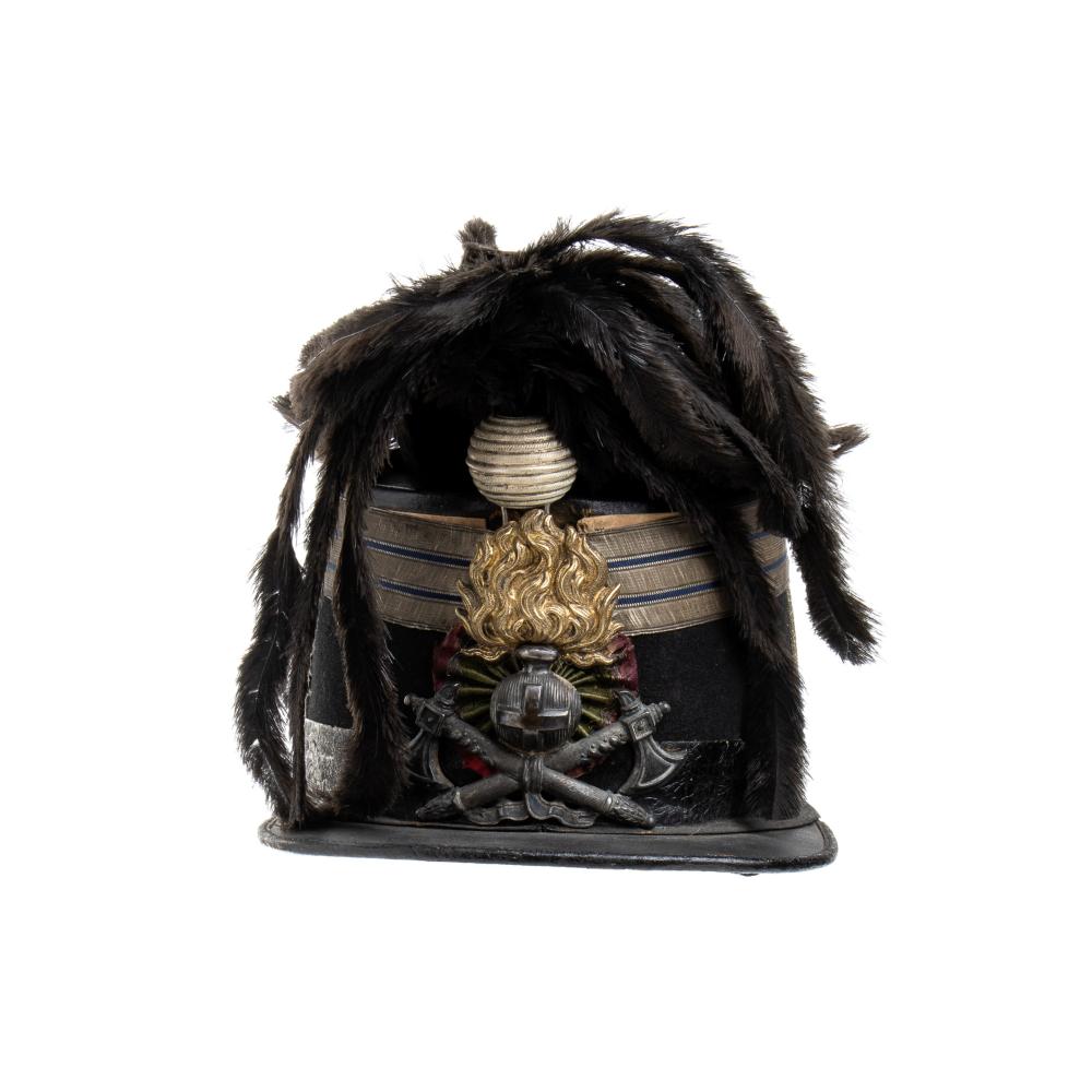 Rarissimo chepì da capitano del genio, corpo in cartone pressato ricoperto di panno turchino scuro, grande fregio in metallo bicolore, gradi a lastra, nappina con pennacchio cadente nero, senza cuffia interna ma in ottimo stato