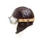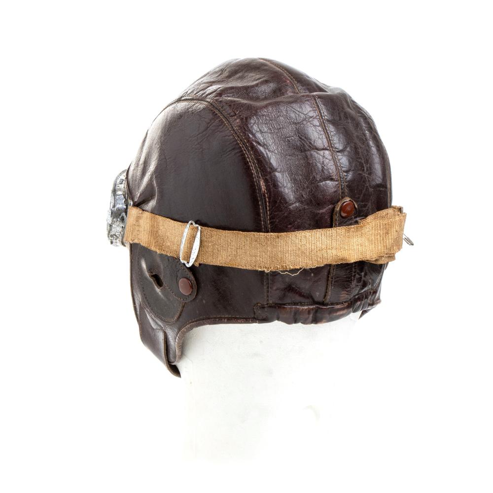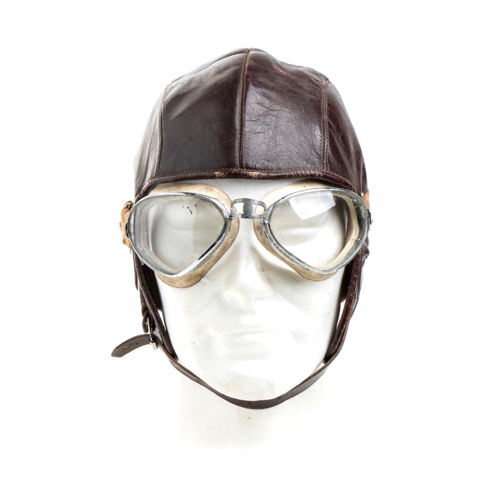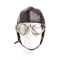 Bella cuffia da pilota in pelle con marchio del fabbricante, occhiali con lenti di celluloide montati in alluminio e banda elastica, ottimo stato