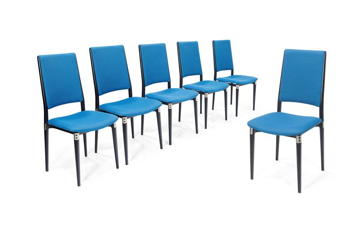 Sei sedie in alluminio pressofuso, legno di palissandro e rivestimento in tessuto.
