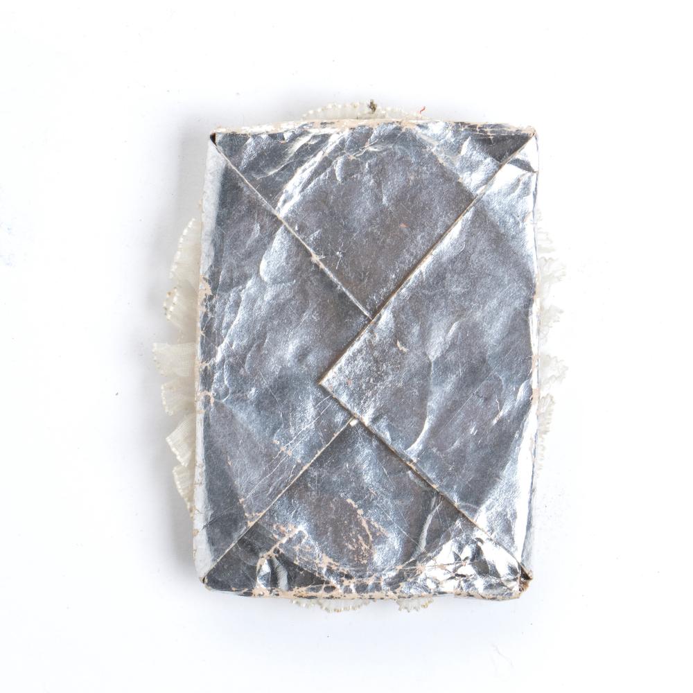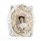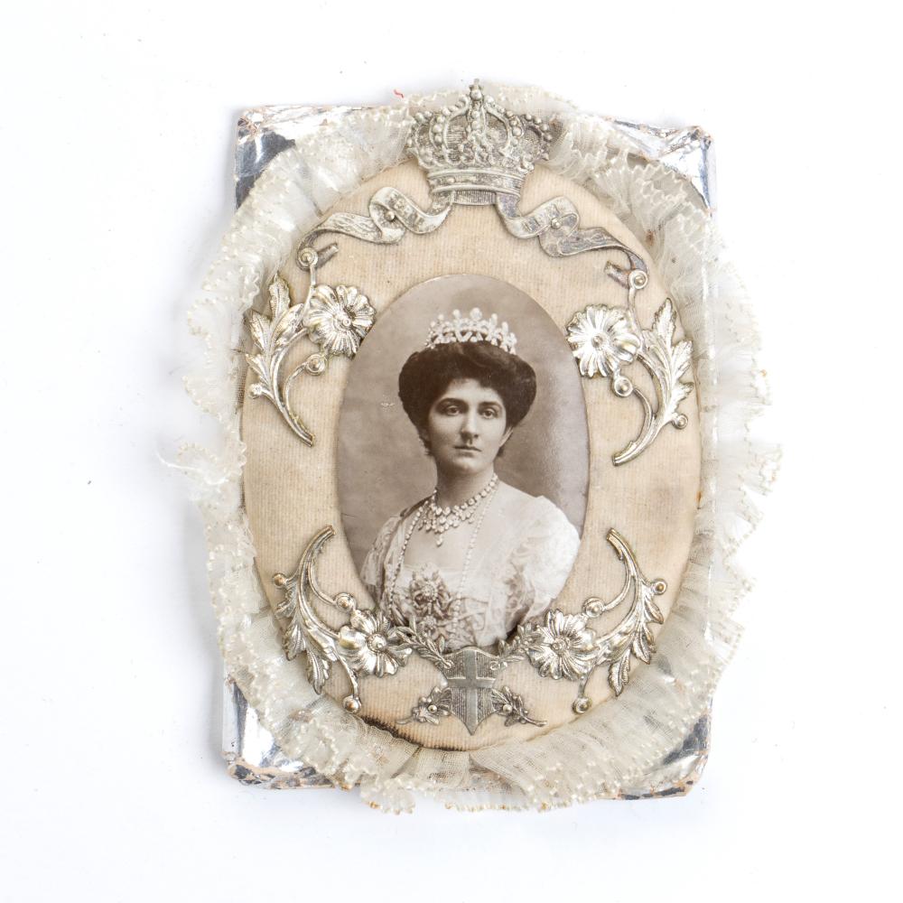 Ritratto della regina Elena montato su cartoncino foderato di seta ed ornato di passamanerie ed elementi in metallo bianco, al verso busta portalettere in carta argentata, in ottimo stato