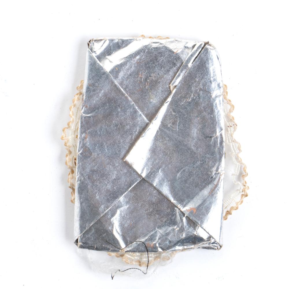 Fotografia della principessa Giovanna di Savoia fanciulla, montata su supporto di cartoncino foderato di seta con applicazioni di corona, scudo sabaudo e decorazioni in metallo bianco, al verso busta porta invito a Corte in carta argentata, invito a corte in occasione del genetliaco della principessa, buone condizioni