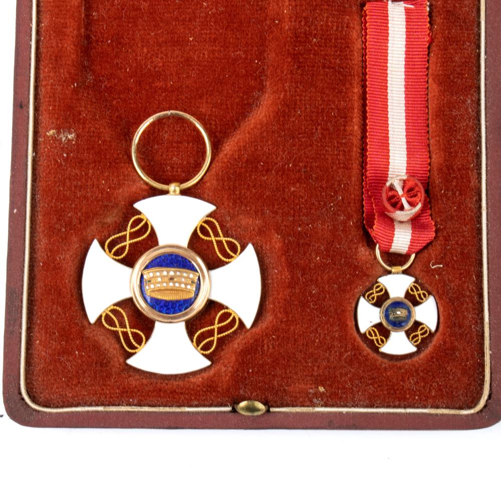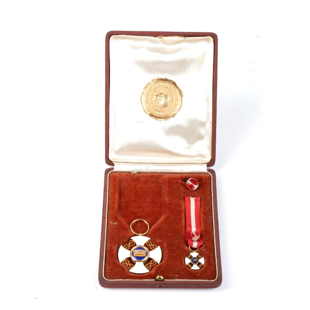 Cofanetto con ordine corona d'italia cav. uff. e medaglia miniatura e rosetta (gioielleria barraia) primo quarto XX sec.