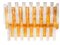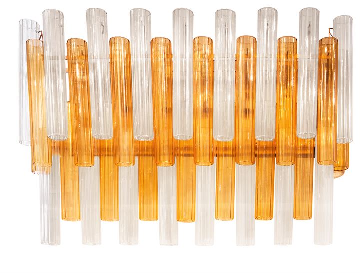 Coppia di lampade da parete con struttura in lamiera laccata ed elementi in vetro soffiato.
