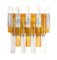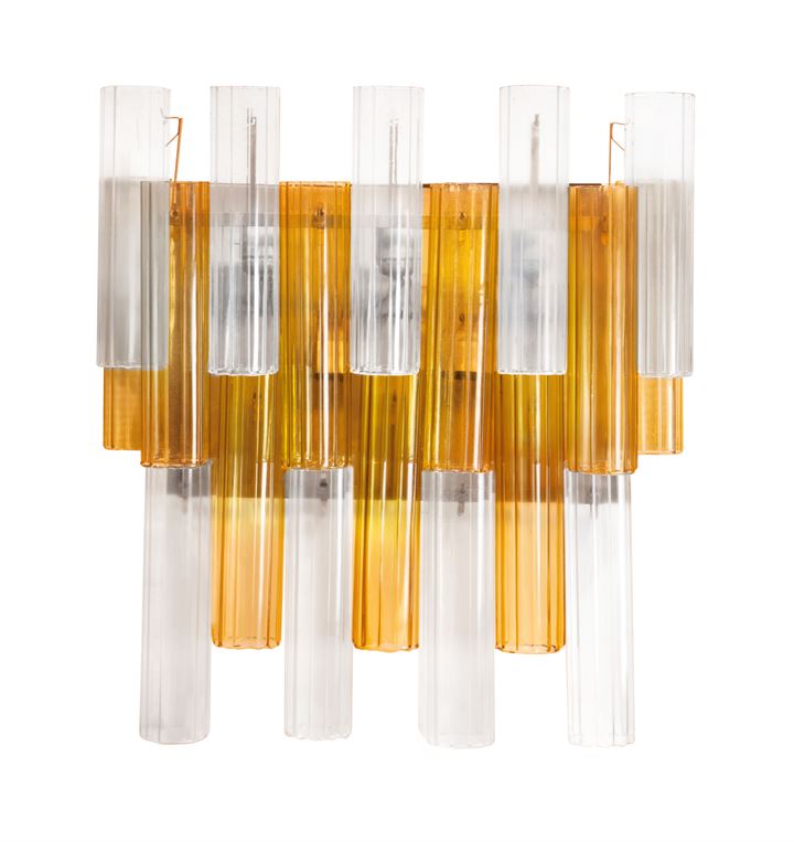 Coppia di lampade da parete con struttura in lamiera laccata ed elementi in vetro soffiato.