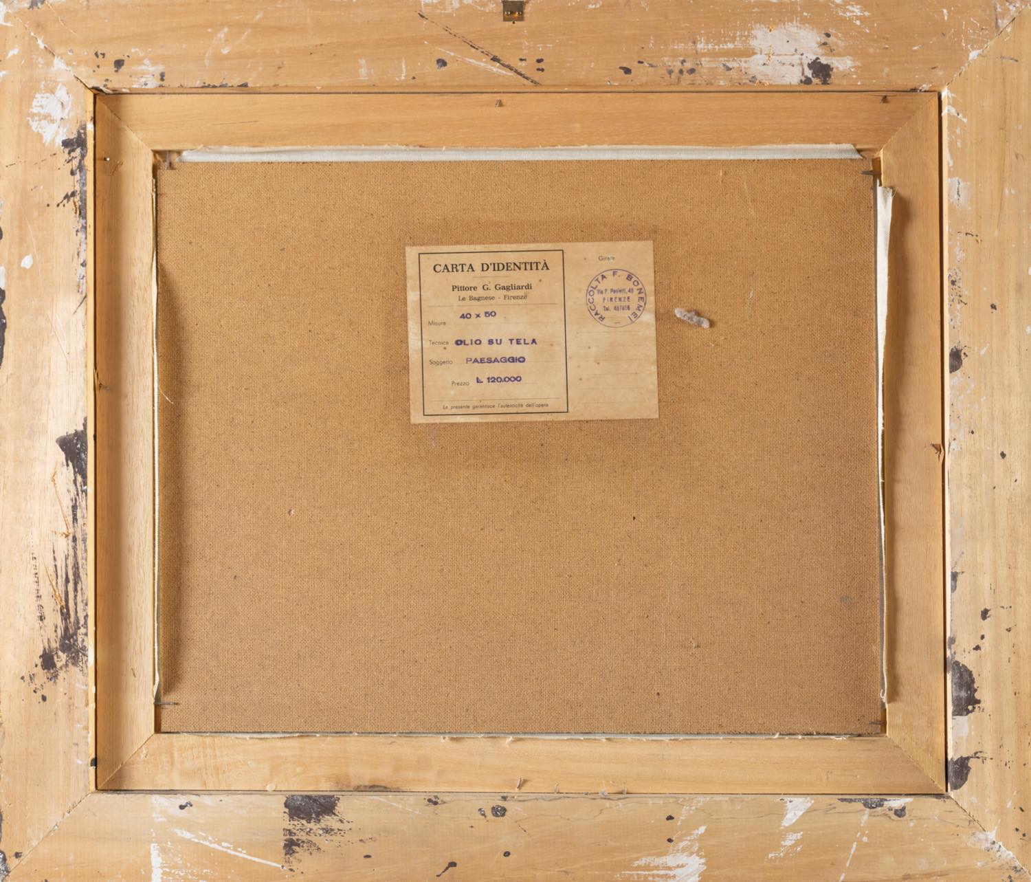 Olio su tela applicata a pannello in masonite, firmato in basso a destra, reca al retro etichetta e timbri “Raccolta F. Bonemei” con autore, dimensioni, tecnica e soggetto, H cm 40x50
