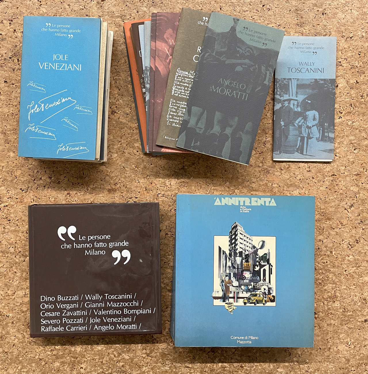 Si allega il catalogo: 'Le persone che hanno fatto grande Milano' dedicato a milanesi illustri tra cui Dino Buzzati, Wally Toscanini, Orio Vergani, Gianni Mazzocchi, Cesare Zavattini, Valentino Bompiani, Severo Pozzati, Jole Veneziani, Raffaele Carrieri e Angelo Moratti