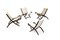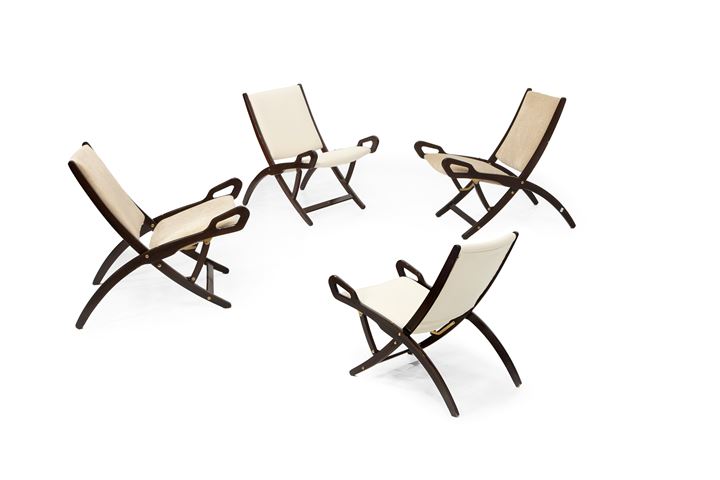 Quattro poltroncine pieghevoli in legno di faggio tinto all'anilina, imbottitura rivestita in tessuto e parti in ottone.