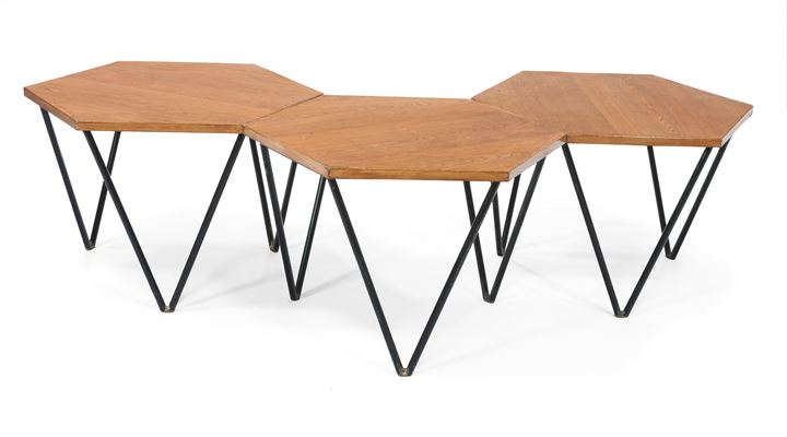 Tavolino in ferro verniciato, impiallacciatura in frassino.