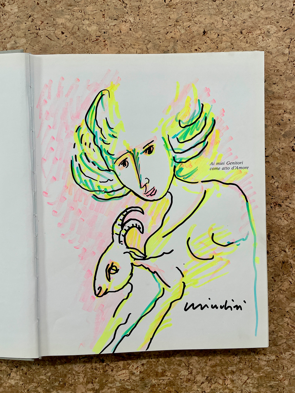 Il catalogo reca all'interno un disegno a pennarelli colorati firmato
