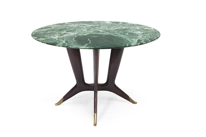 Tavolo rotondo con struttura in legno di mogano e piano in marmo verde.