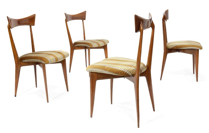 PARISI ICO Quattro sedie in legno d'acero tinto e rivestimento in tessuto...