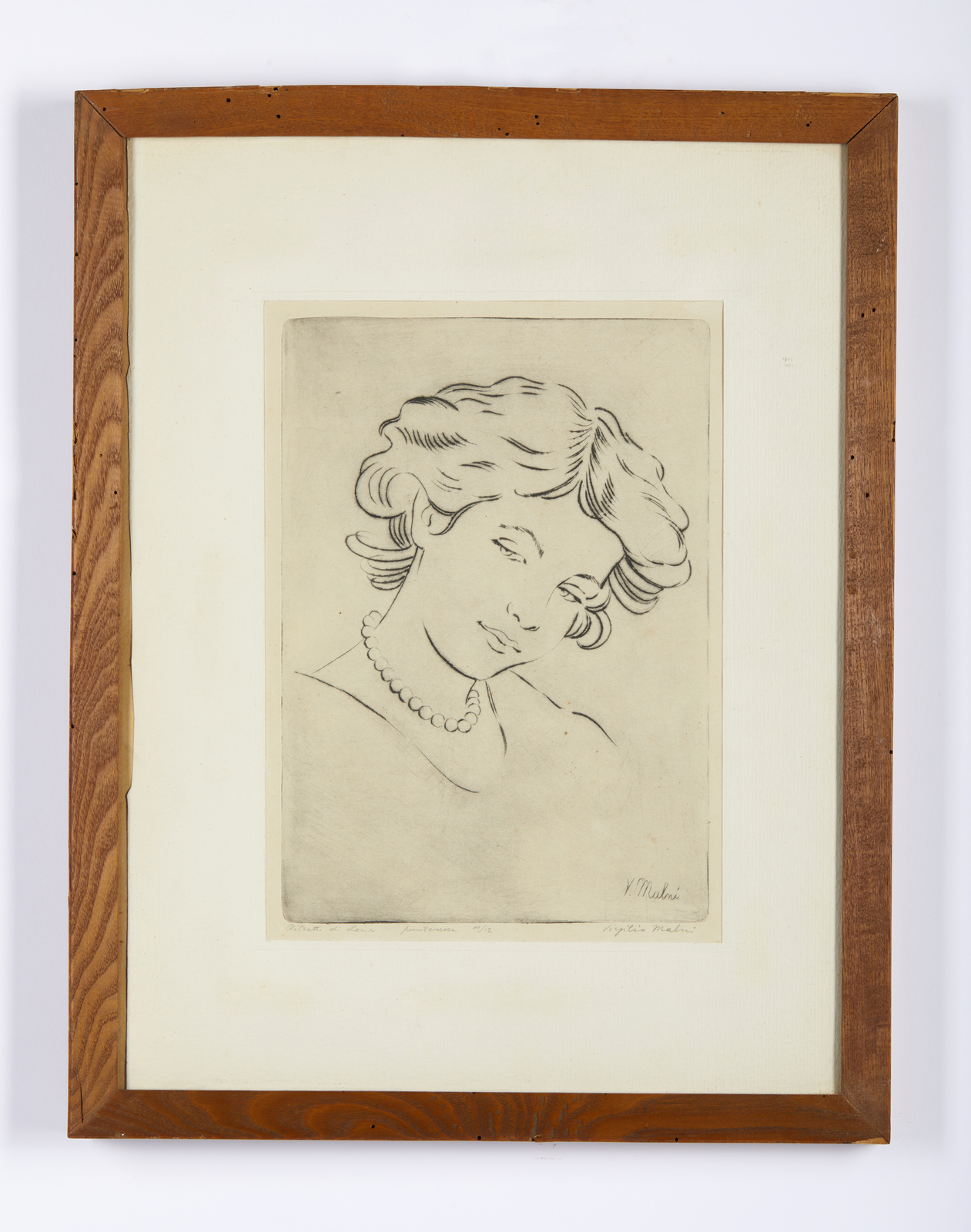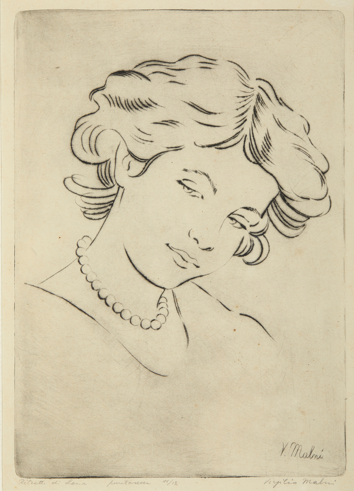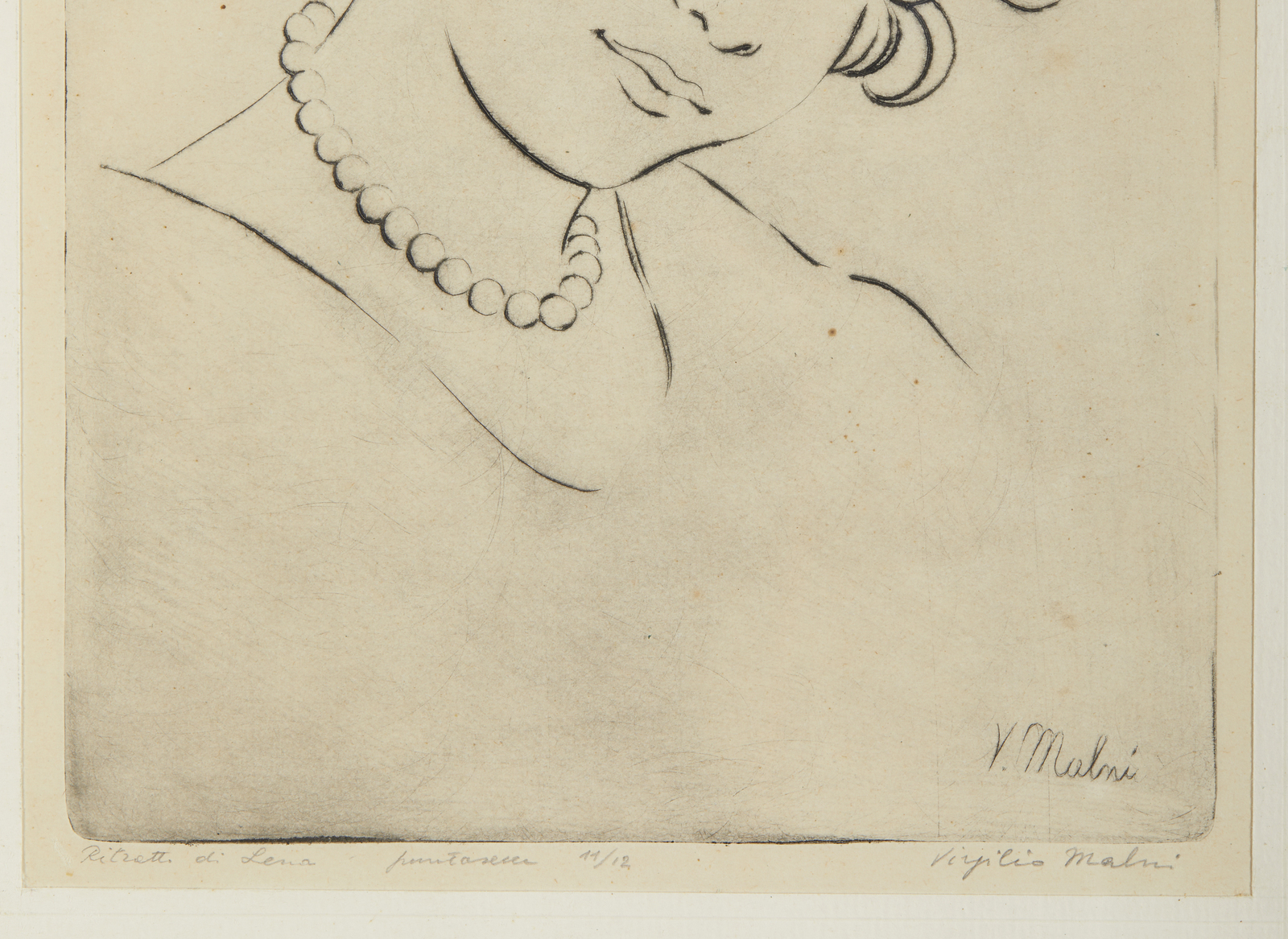 MALNI VIRGILIO (1912 - 1984) Ritratto di Lena. Puntasecca. Cm 25,00 x 34,00. 11/12. Tiratura, titolo e firma in basso a matita. Firma in basso a destra a lastra. Dimensione lastra: 28x20 cm. Lievi difetti. Cornice presente
