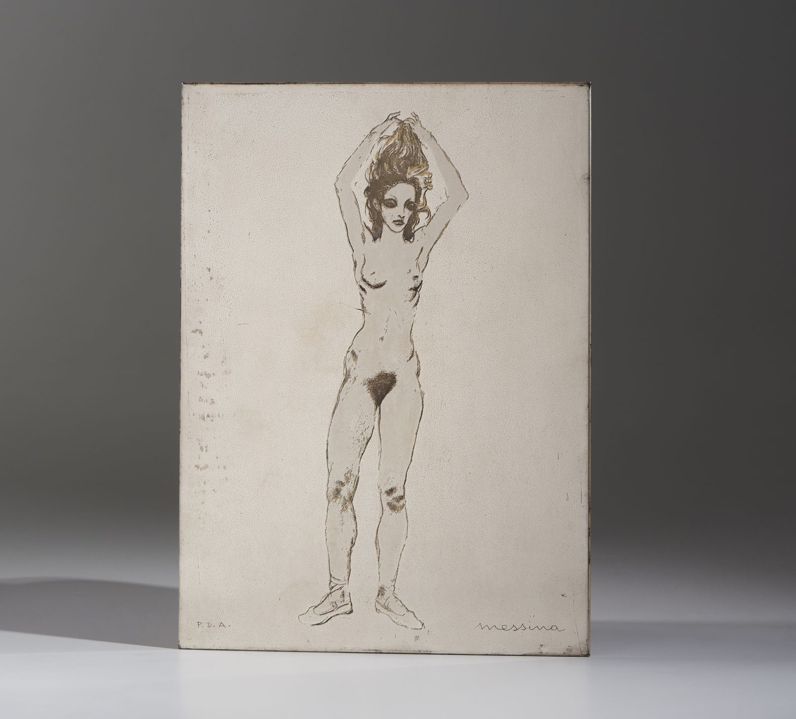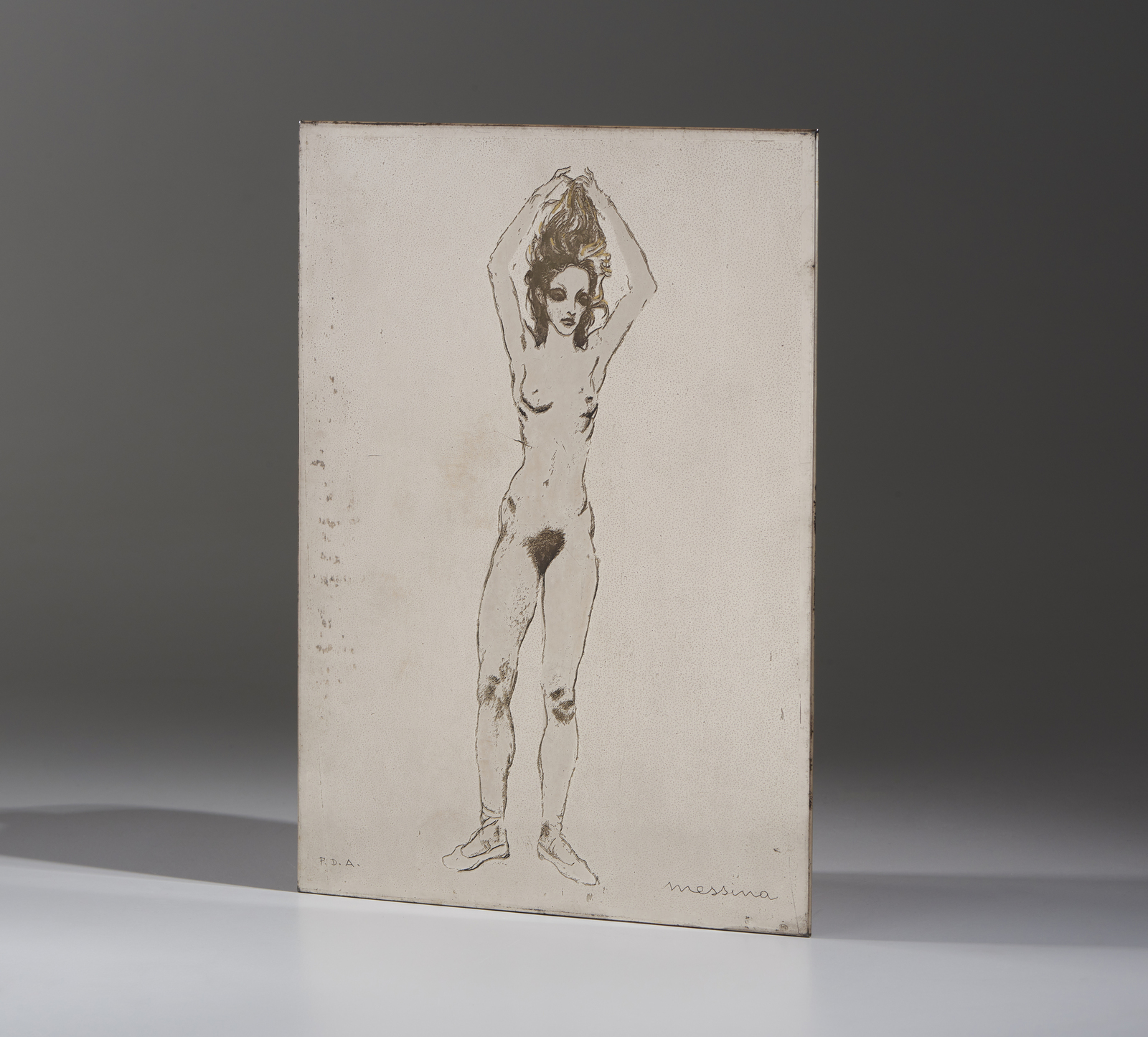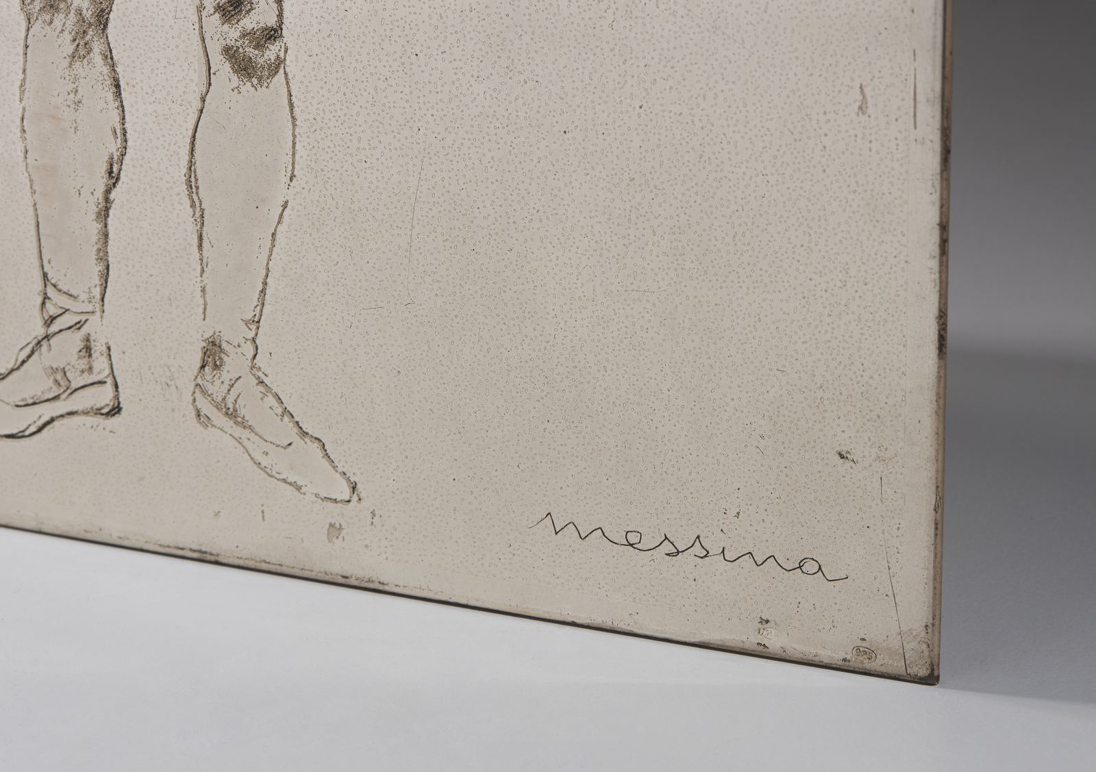 MESSINA FRANCESCO (1900 - 1995) Senza titolo. Incisione su argento. Cm 18,00 x 24,00. P.D.A. Tiratura e firma incise in basso. Punzone argento 925 in basso a destra. Difetti.