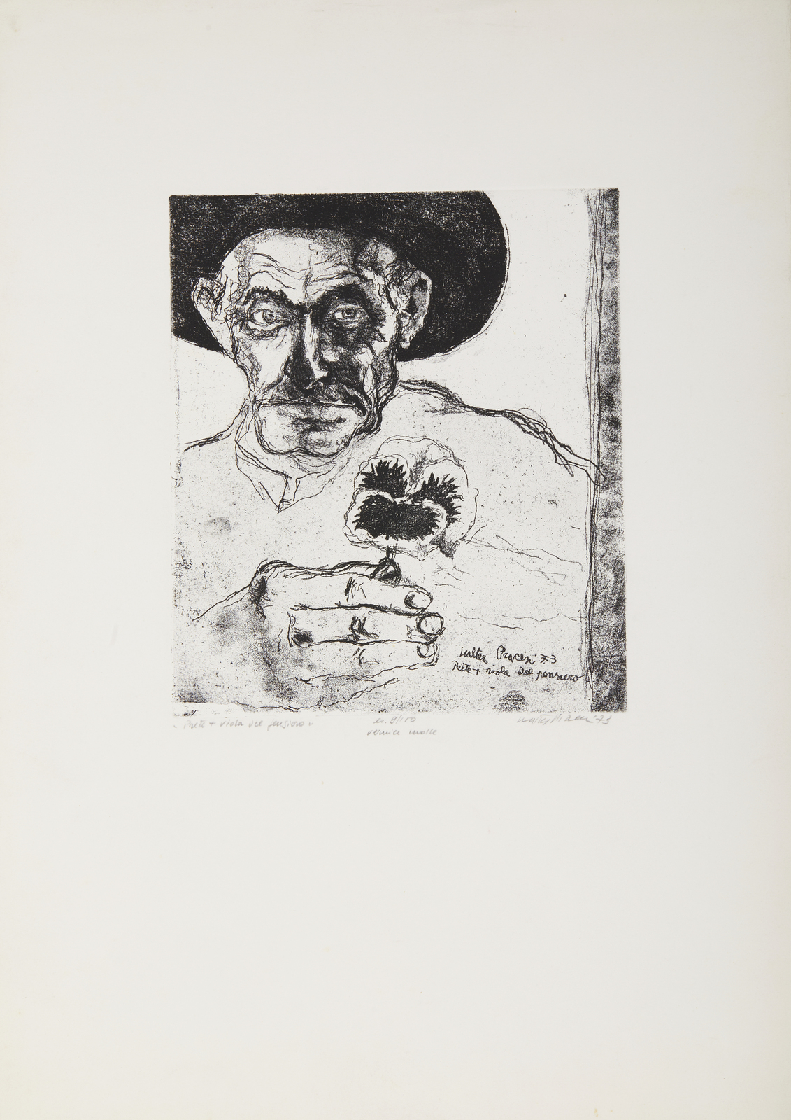 PIACESI WALTER (n. 1929) Prete + viola del pensiero. 1973. Vernice molle. Cm 50,00 x 69,50. 9/150. Tiratura, titolo, firma e anno in basso a matita. Firma, titolo e anno in basso a destra a lastra. Dimensione lastra: 32x27.5 cm. Lievi difetti.