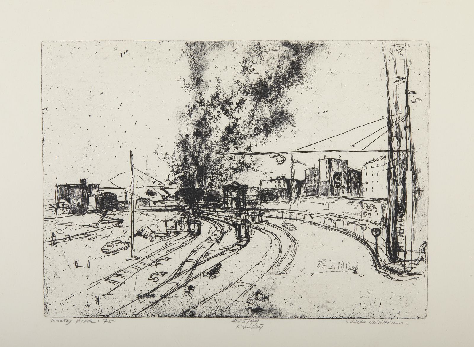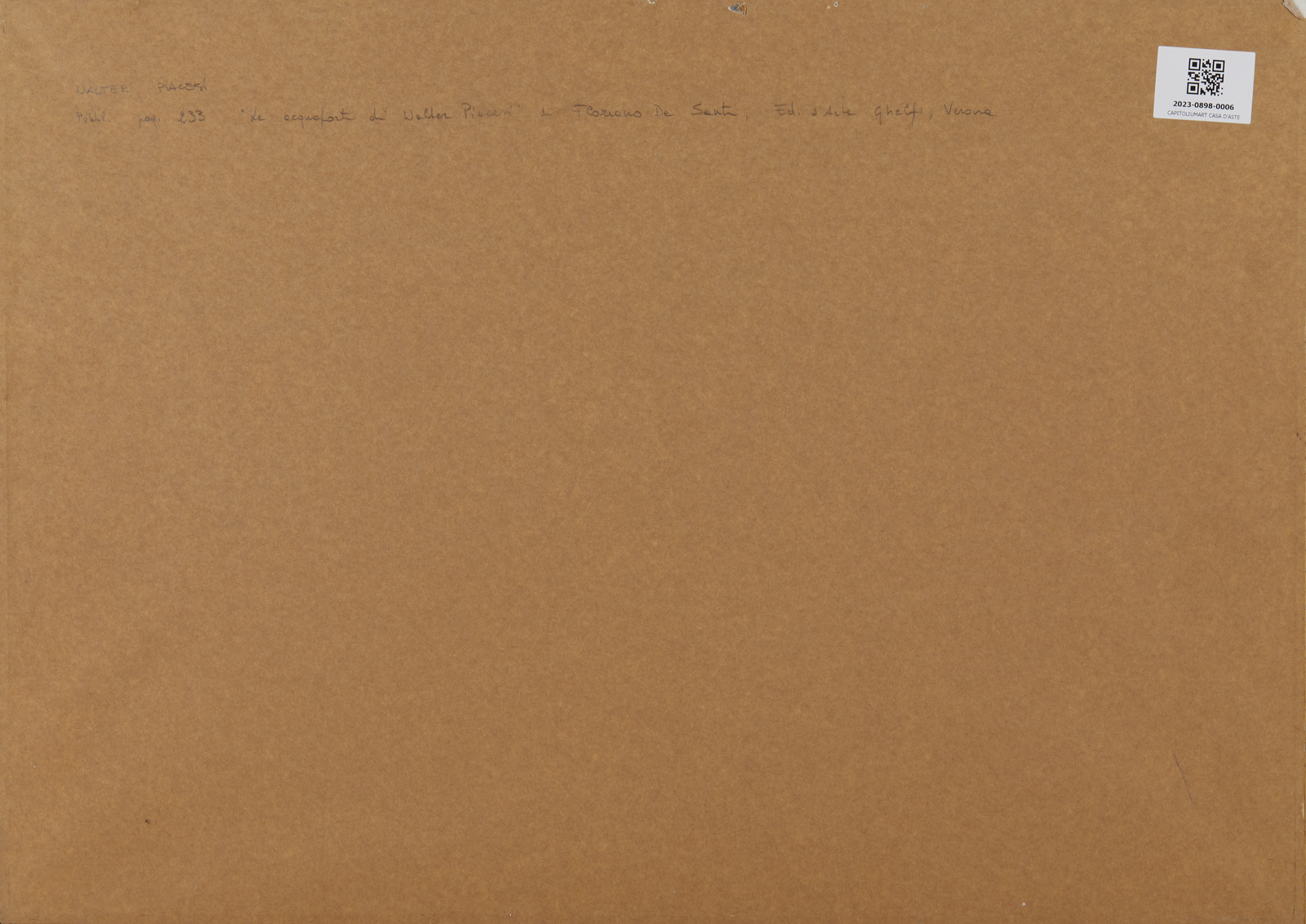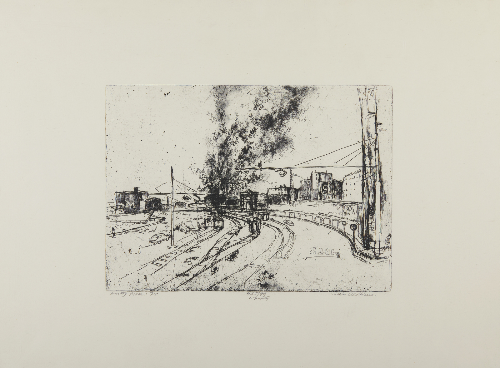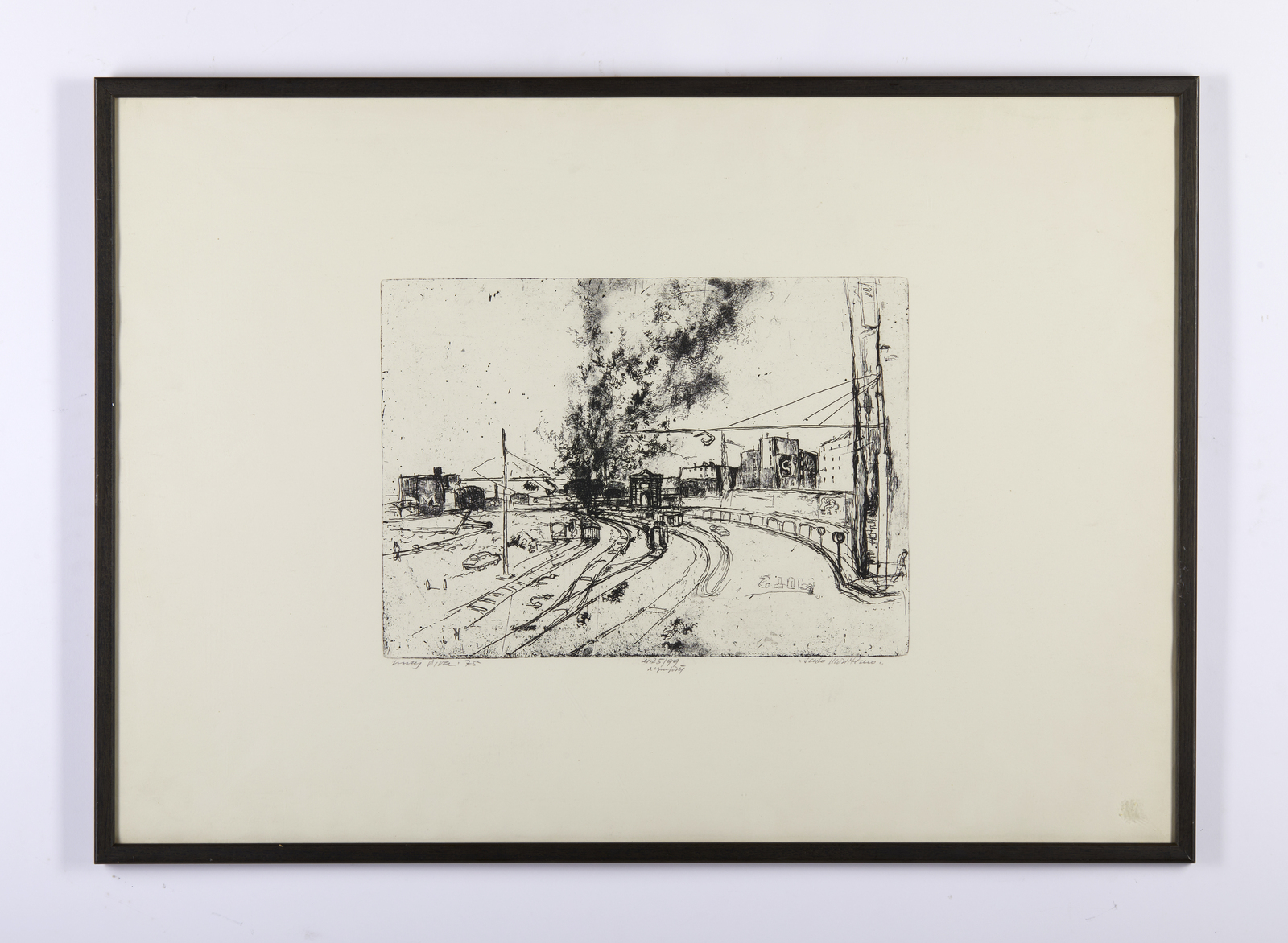 PIACESI WALTER (n. 1929) Scalo marittimo. 1975. Acquaforte. Cm 70,00 x 50,00. 25/99. Tiratura, titolo, firma e anno in basso a matita. Dimensione lastra: 24.5x34.5 cm. Pubblicazioni: Le acqueforti di Walter Piacesi, a cura di Floriano De Santi, Edizioni d'Arte Ghelfi, Verona, p. 233. Cornice presente