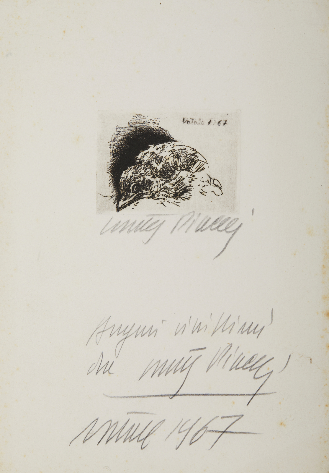 PIACESI WALTER (n. 1929) Biglietto di Natale. 1967. Acquaforte. Cm 17,50 x 25,00. Firma, dedica e anno in basso a matita. Anno in alto a destra in lastra. Dimensione lastra: 5.5x7.5 cm. Difetti.