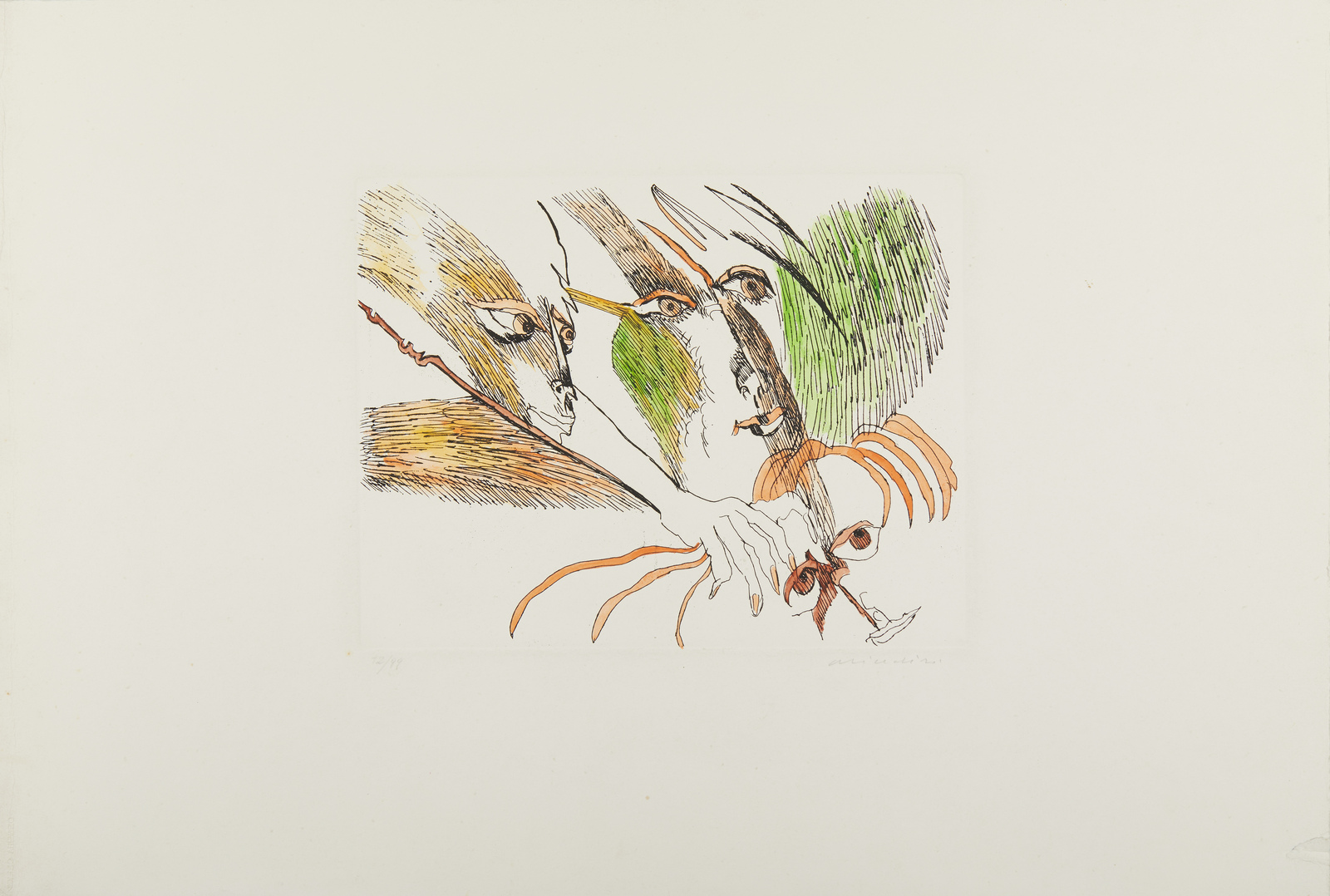 BRINDISI REMO (1918 - 1996) Senza titolo. . Acquaforte e acquatinta. Cm 70,00 x 47,00. 12/99. Tiratura e firma in basso a matita. Dimensioni lastra: 24,5x31,5cm. Difetti.