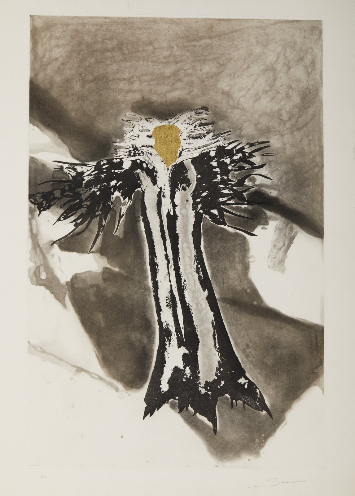 SOMAINI FRANCESCO (1926 - 2005) Senza titolo. Acquaforte, acquatinta e collage. Cm 50,00 x 69,50. P.a. Tiratura e firma in basso a matita. Timbro a secco Giorgio Upiglio in basso a sinistra. Dimensione lastra: 62.54x41 cm.