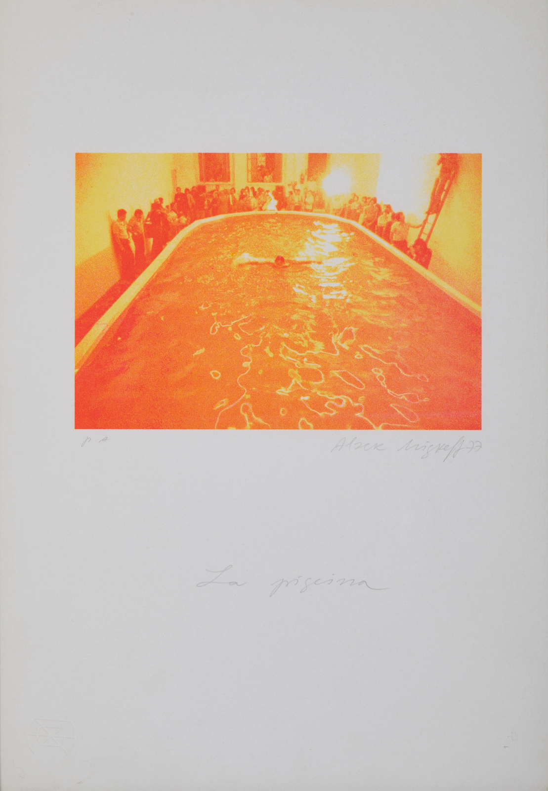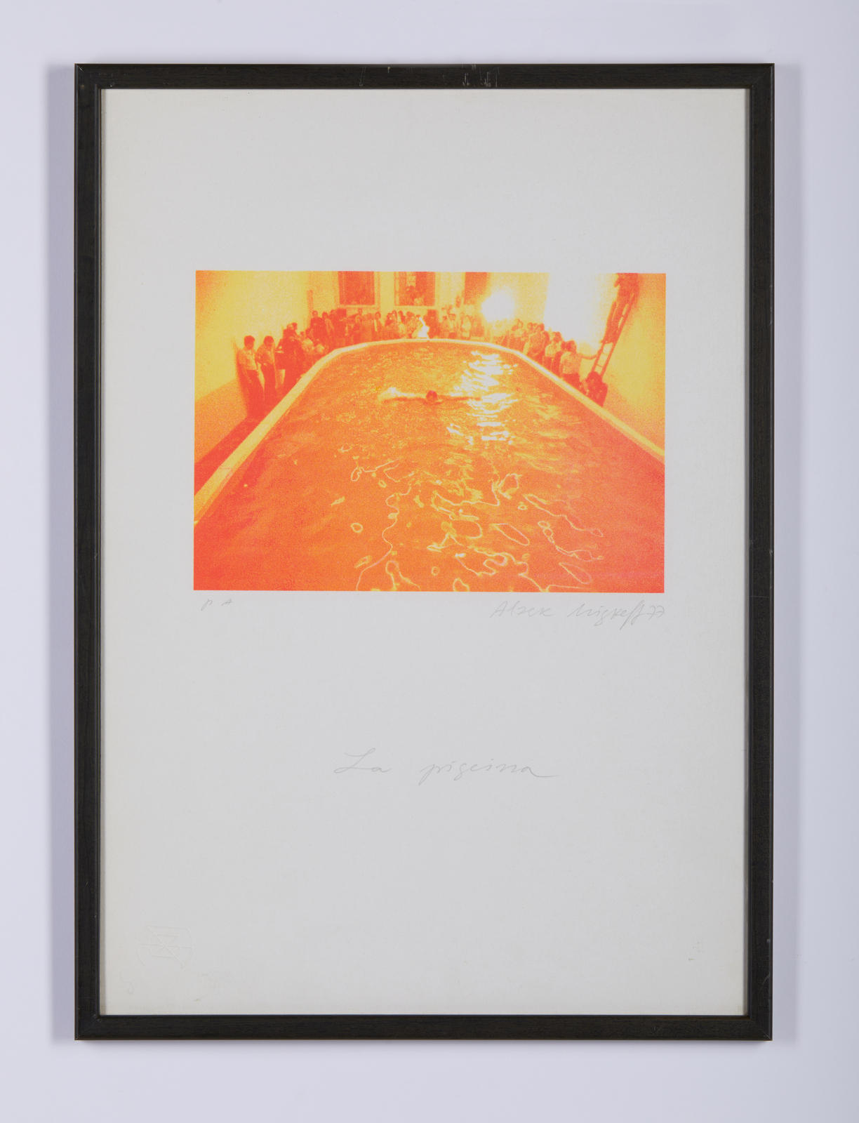 MISHEFF ALZEK (n. 1940) La piscina. 1977. Litografia. Cm 35,00 x 50,00. P.a. Tiratura, titolo, firma e anno in basso a matita. Timbro a secco in basso a sinistra. Lotto proveniente dalla cartella "La piscina" composta da 4 litografie. Cornice presente