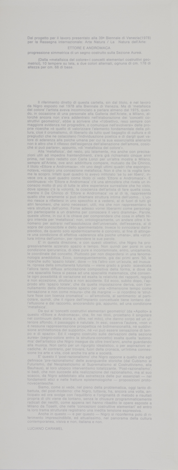NIGRO MARIO (1917 - 1992) Ettore e Andromaca. Serigrafia (cartella completa). Cm 27,50 x 71,00. 59/100. Cartella composta da n.10 fogli firmati e numerati al retro a matita. Entro custodia originale. Editore Studio d’Arte Contemporanea Dabbeni. Le dimensioni segnalate in catalogo sono di ciascun foglio. L’opera è stata realizzata dal progetto per il lavoro presentato alla 39° Biennale di Venezia (1978) per la Rassegna Internazionale: Arte Natura/ La Natura dell’Arte: “ETTORE e ANDROMACA”. Prefazione contenuta nella cartella a cura del prof. Luciano Caramel.
