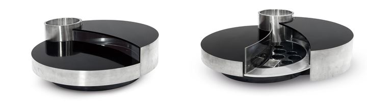 Tavolo da salotto con bar a scomparsa e illuminazione integrata, ribaltabile e girevole.