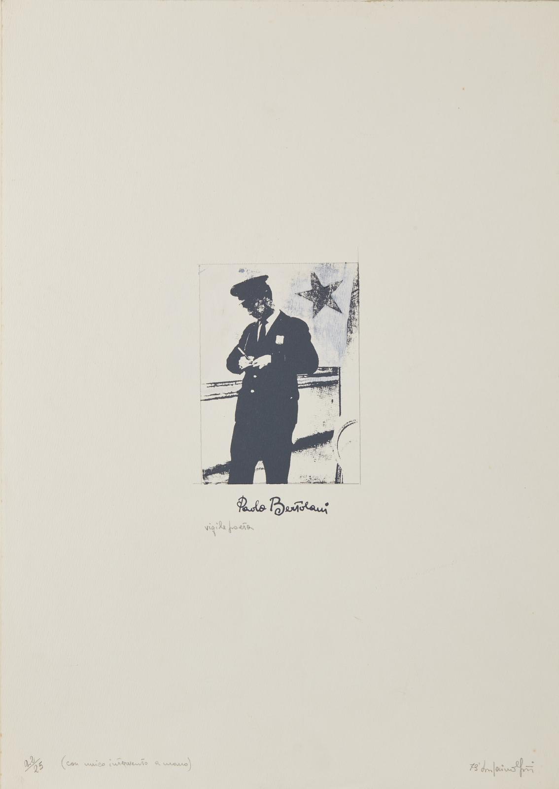 MAINOLFI LUIGI (n. 1948) Vigile poeta. 1973. Retouchè su serigrafia.. Cm 35,50 x 50,00. 22/25 (con unico intervento a mano). Tiratura, firma e anno in basso a matita. Titolo al centro. Lievi difetti.