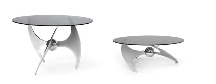 Tavolo regolabile a due altezze, struttura in alluminio e acciaio cromato, piano in vetro fumé.