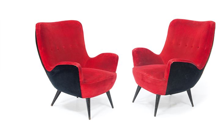 Coppia di poltrone con struttura in legno e imbottitura in velluto.