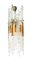 Lampada a sospensione con struttura in metallo cromato ed elementi in vetro trasparenti e colorati.