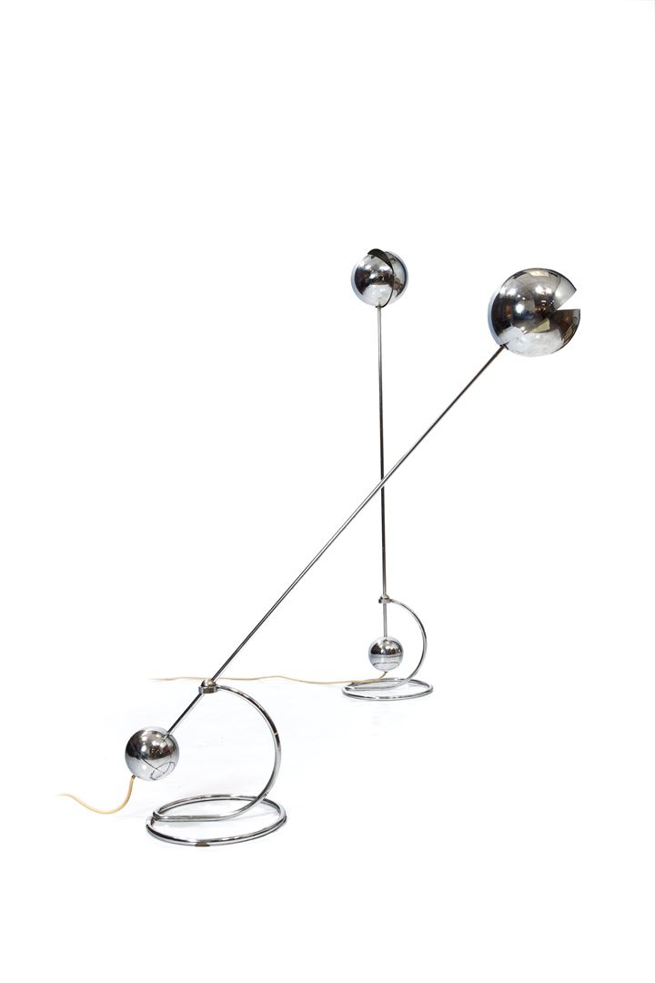 Coppia di lampade da terra orientabili in acciaio cromato e riflettore regolabile.