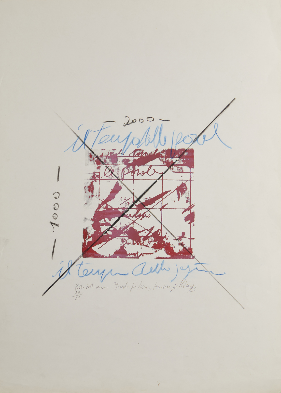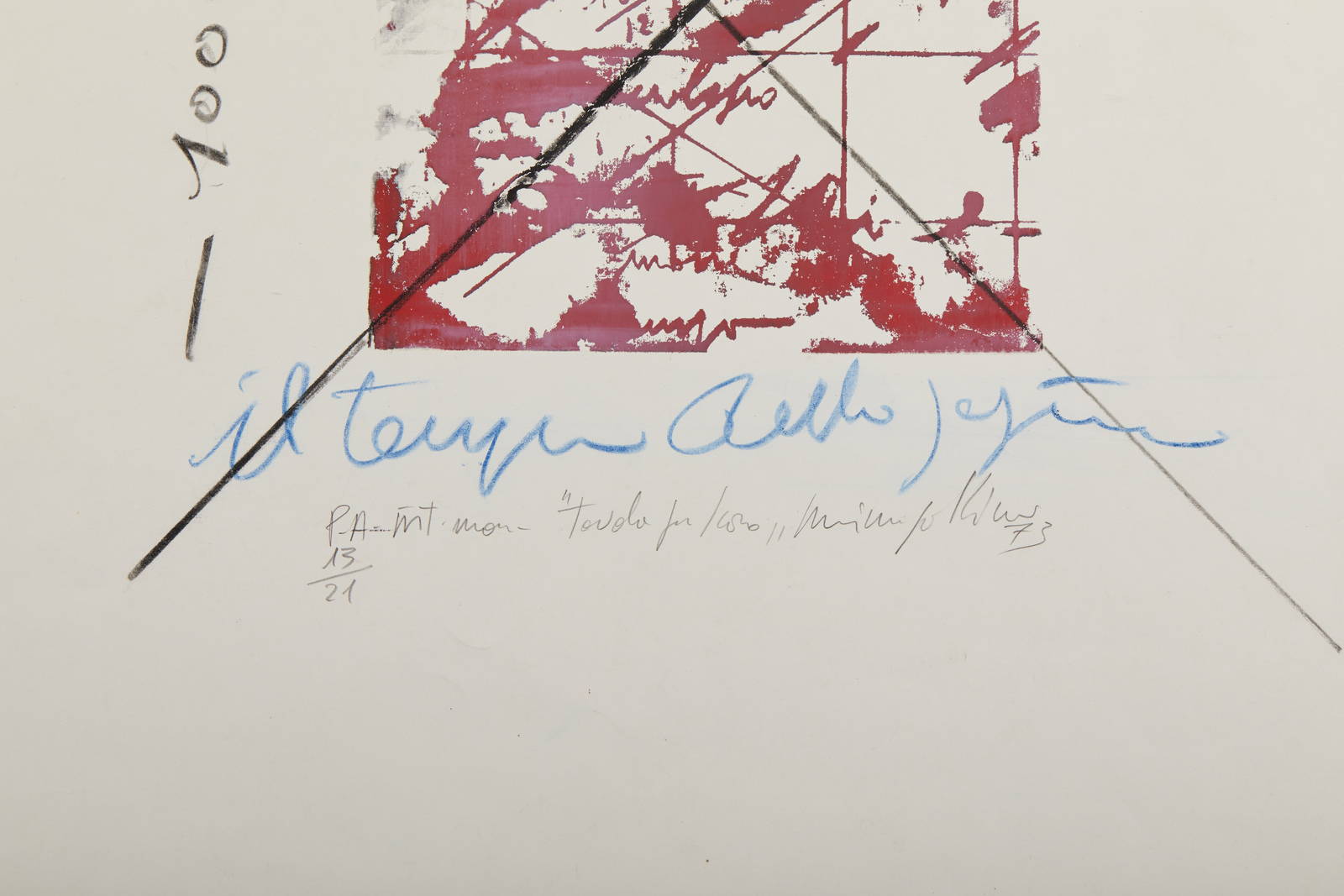 PALADINO MIMMO (n. 1948) Tavola per libro. . 1973. Retouchè su serigrafia.. Cm 50,00 x 70,00. P.A. 13/21 (con intervento manuale). Tiratura, firma, anno e titolo in basso a matita. Difetti.