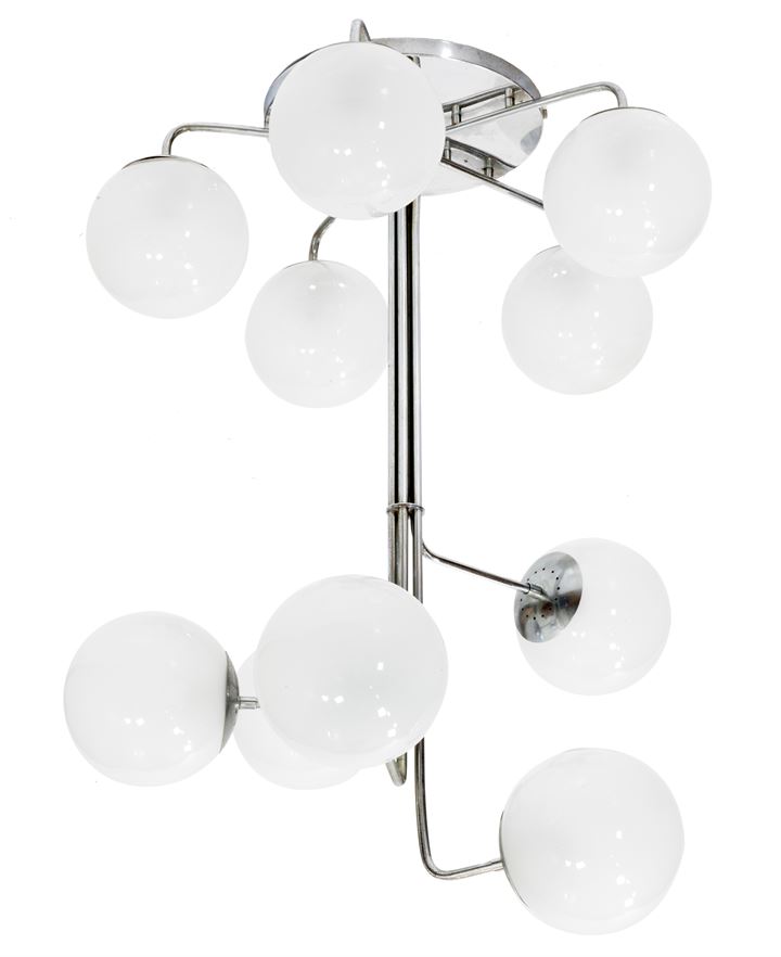 Lampada a sospensione in acciaio cromato e diffusori in vetro opalino.