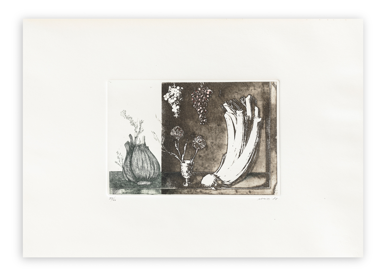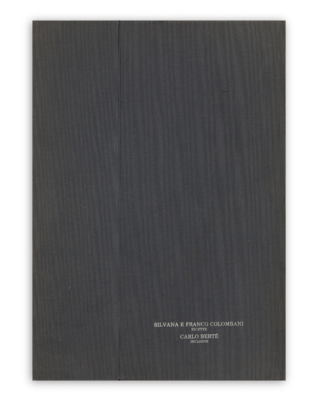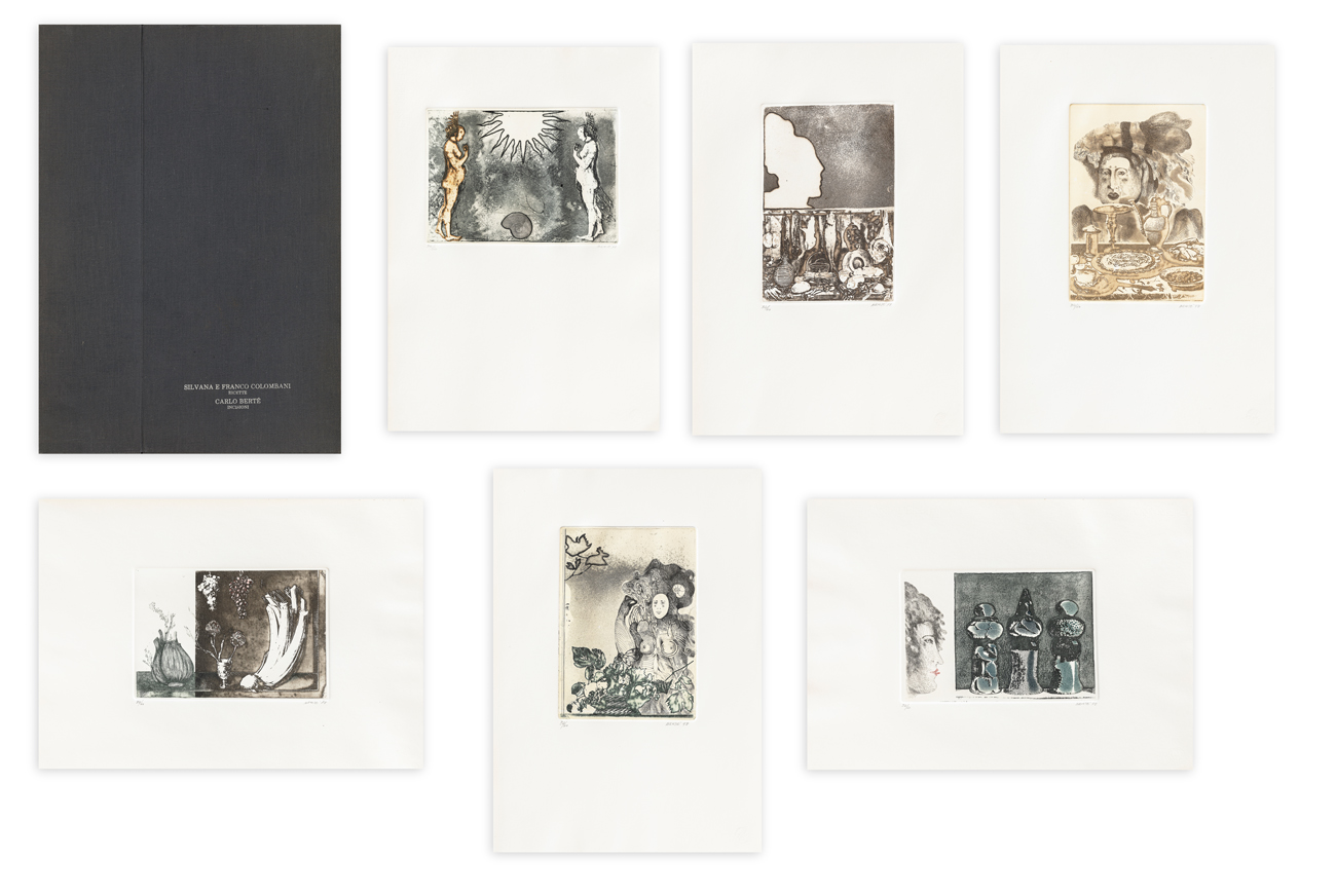 Cartella contenente ricette di Silvana e Franco Colombani illustrate da 6 incisioni di Carlo Bertè, ciascuna recante firma, datazione e numerazione (Esemplari 34/60) a matita al fronte e timbro a secco dell'Editore