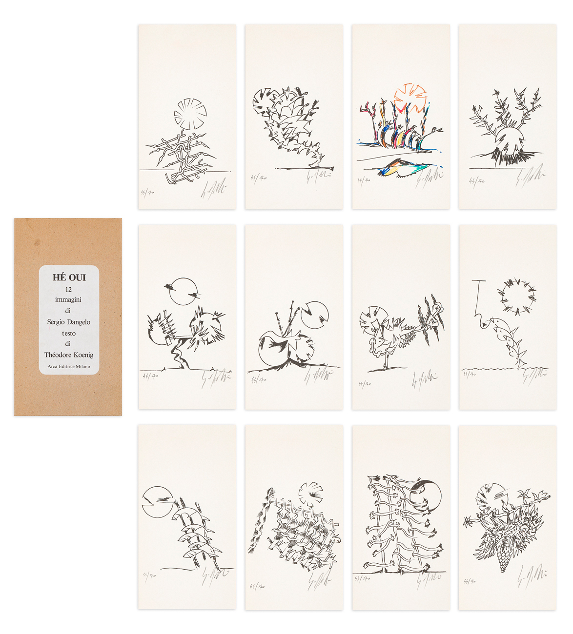 Piccola cartella contenente testo di Théodore Koenig e 12 litografie di Sergio Dangelo, ciascuna recante firma e numerazione (Esemplari 45/70) a matita al fronte