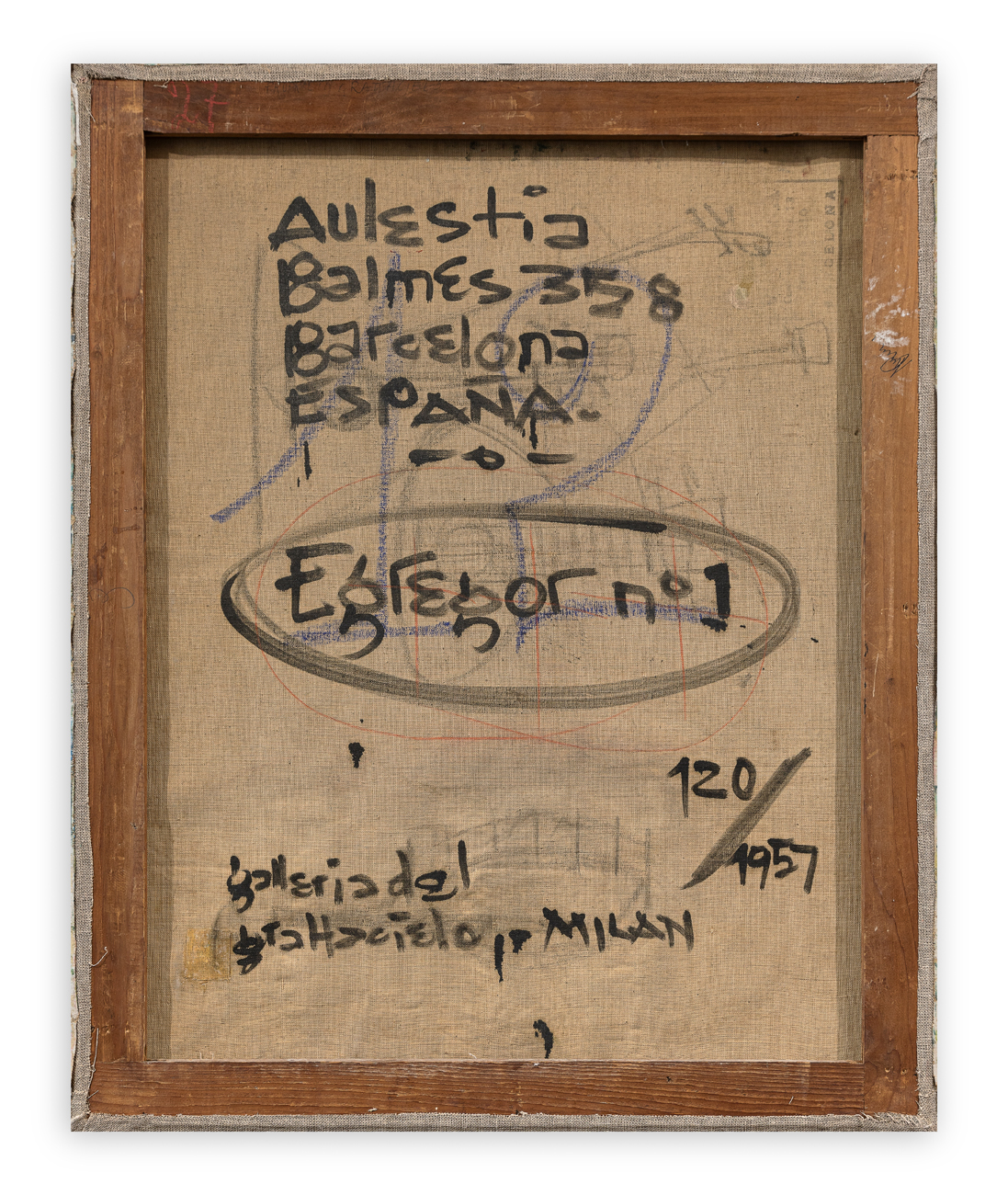 Firma, titolo, datazione, località (Barcellona) e iscrizione "Galleria del Grattacielo, Milano" al retro