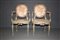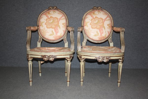 Coppia di poltroncine in legno intagliato e laccato con schienale e seduta imbottiti. Inizi XX secolo. Difetti.