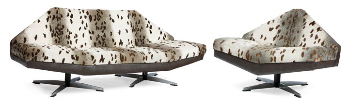 Divano con struttura in metallo cromato e imbottitura in tessuto e profili in similpelle.