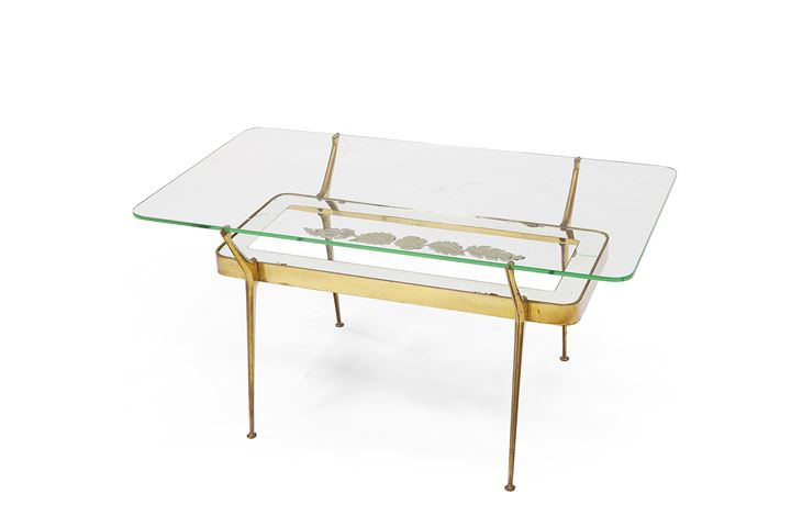 LACCA CESARE Tavolino da salotto in ottone e cristallo molato e inciso. Anni...