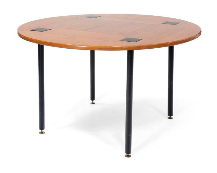 Tavolo con struttura in metallo laccato e piano in massello di palissandro.