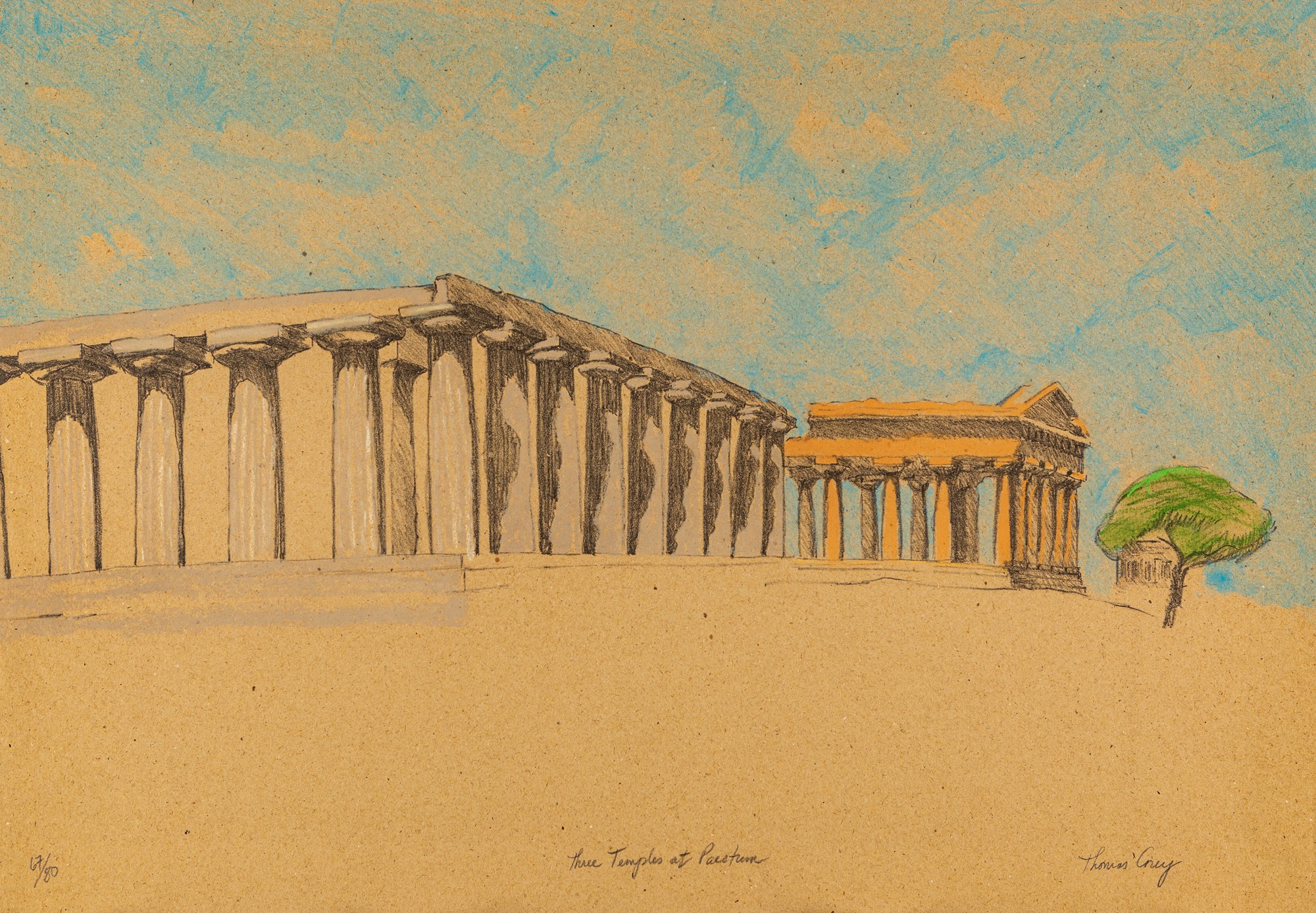 Thomas Corey New York 1950 Three Temples of Paestum 1983 Litografia e colorazione a pastello a mano cm 55x78 Firma, titolo e numerazione "Thomas Corey 67/80". Etichetta dello stampatore