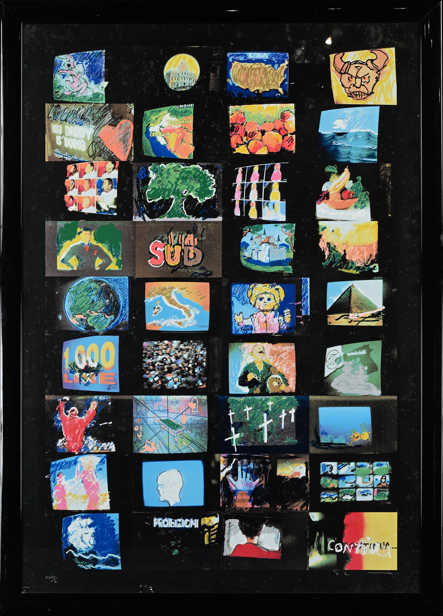 Mario Schifano Homs 1934-Roma 1998 Ricordo della Quadriennale Serigrafia polimaterica cm 100x70 - in cornice cm 107x77 Firma e numerazione "Schifano XXVII/L". Al verso reca etichetta della Galleria Lombardi Roma