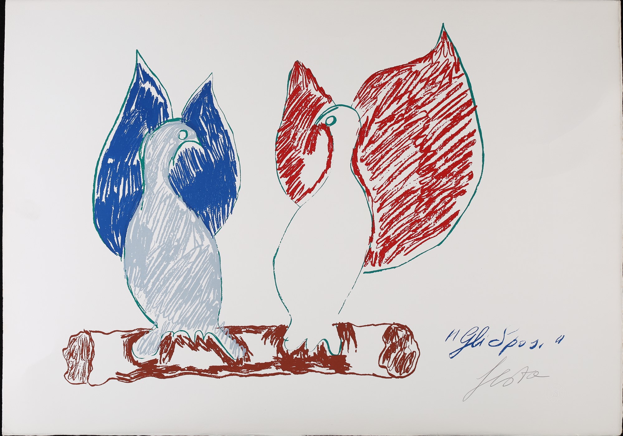 Tano Festa Roma 1938-Roma 1988 Gli sposi Serigrafia cm 50x70 Firma sul fronte "Festa". Timbro a secco Il Labirinto, Roma