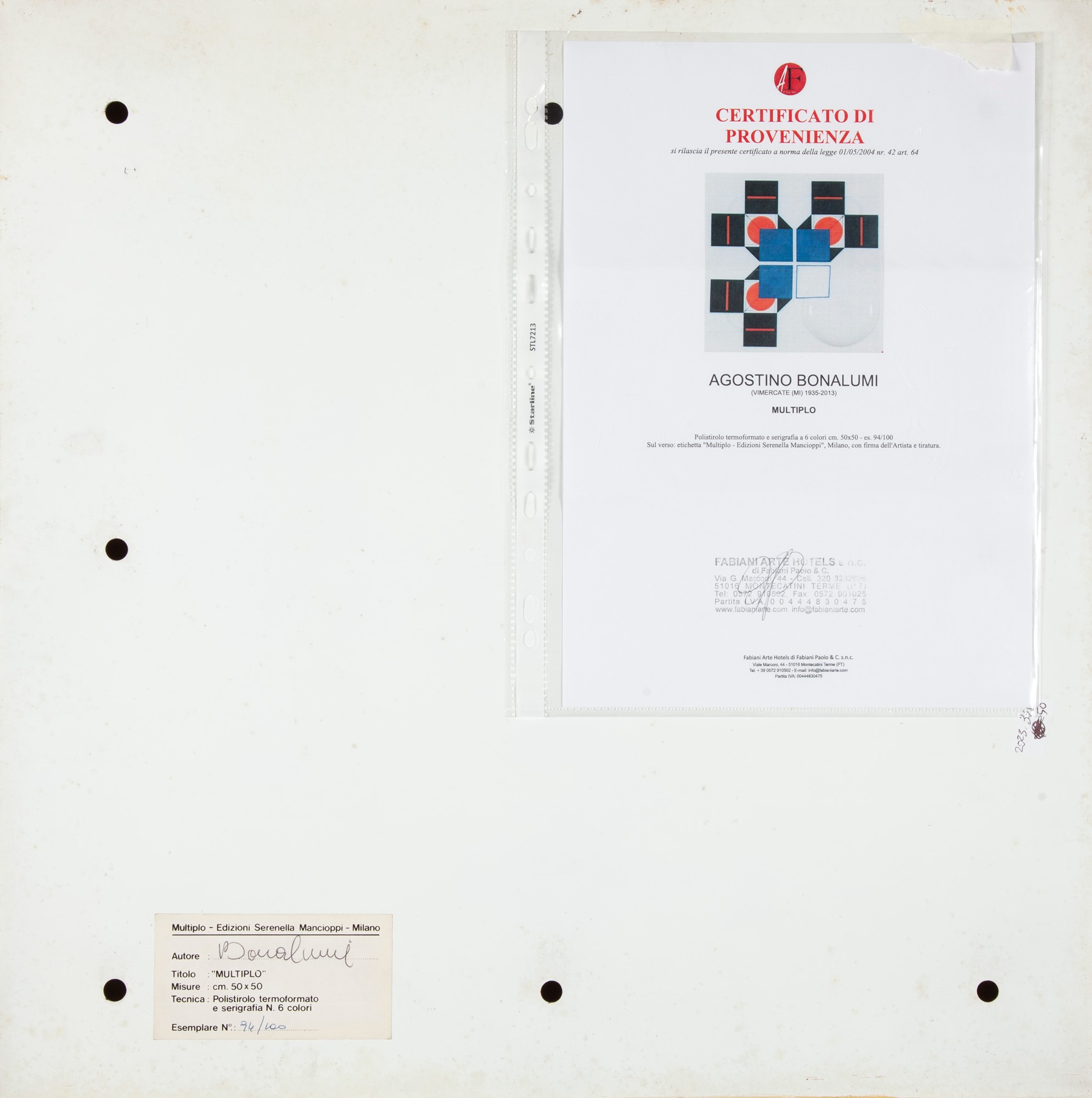 AGOSTINO BONALUMI Vimercate 1935-Desio 2013 Senza titolo Scultura multiplo in polistirolo termoformato e serigrafia a 6 colori cm 50x50 Al verso reca etichetta "Multiplo - edizioni serenella mancioppi, Milano", firmata "Bonalumi" e numerata 94/100.