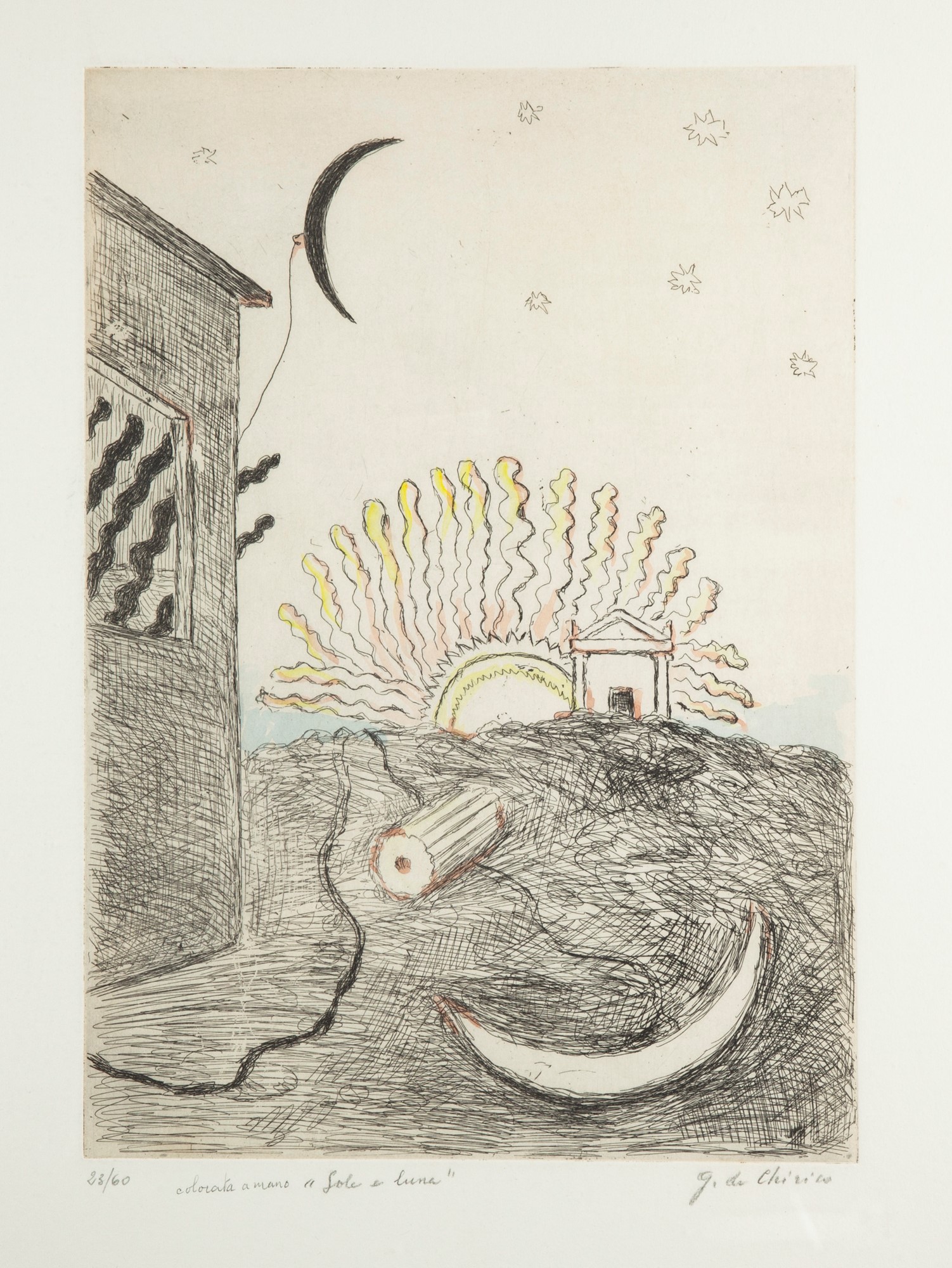 Giorgio De Chirico (Volo 1888-Roma 1978) Sole e Luna Incisione acquarellata...
