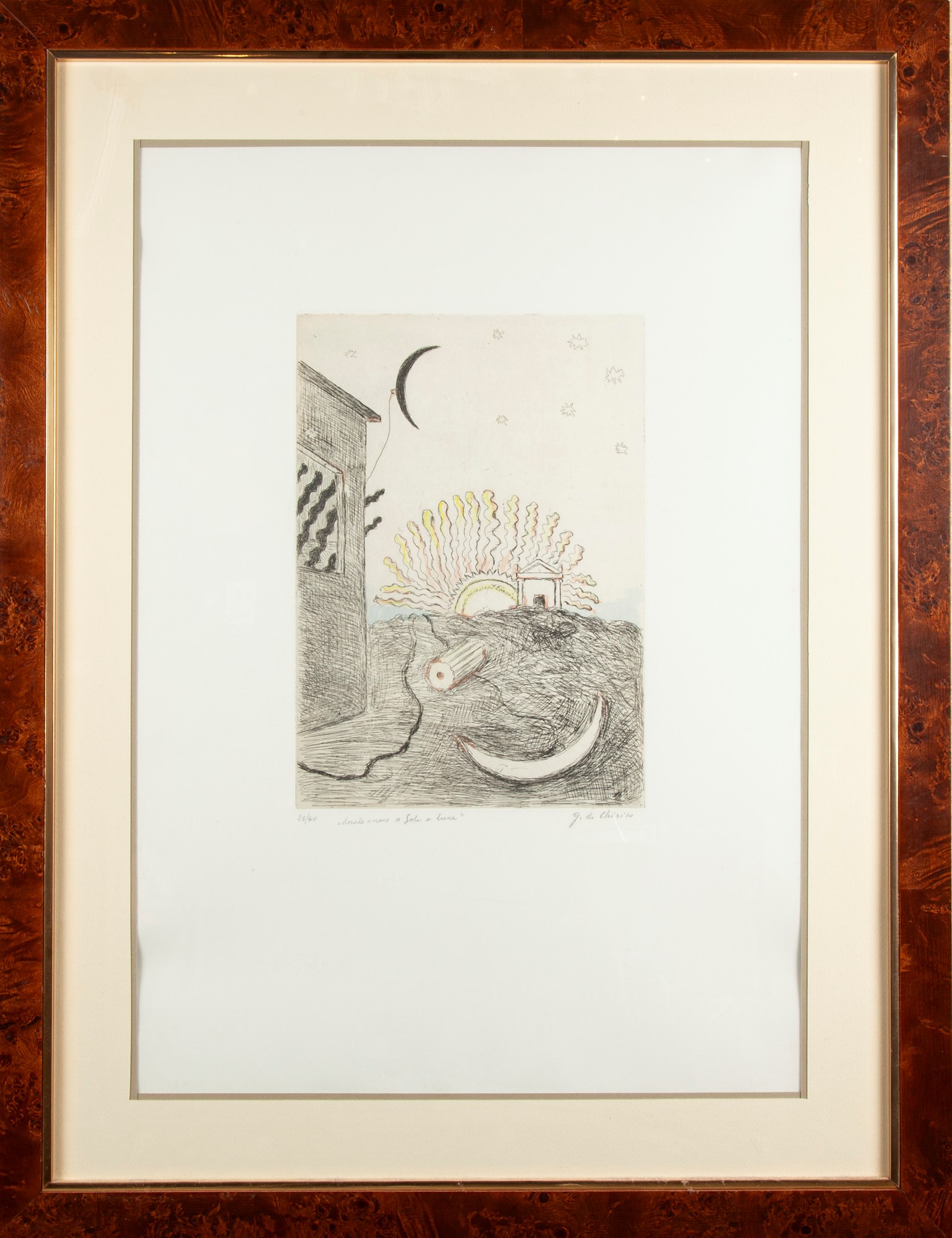 Sole e Luna Incisione acquarellata cm 67x47 - in cornice cm 88x68 In basso a matita firma titolo e numerazione "G. De Chirico 23/60, colorata a mano"