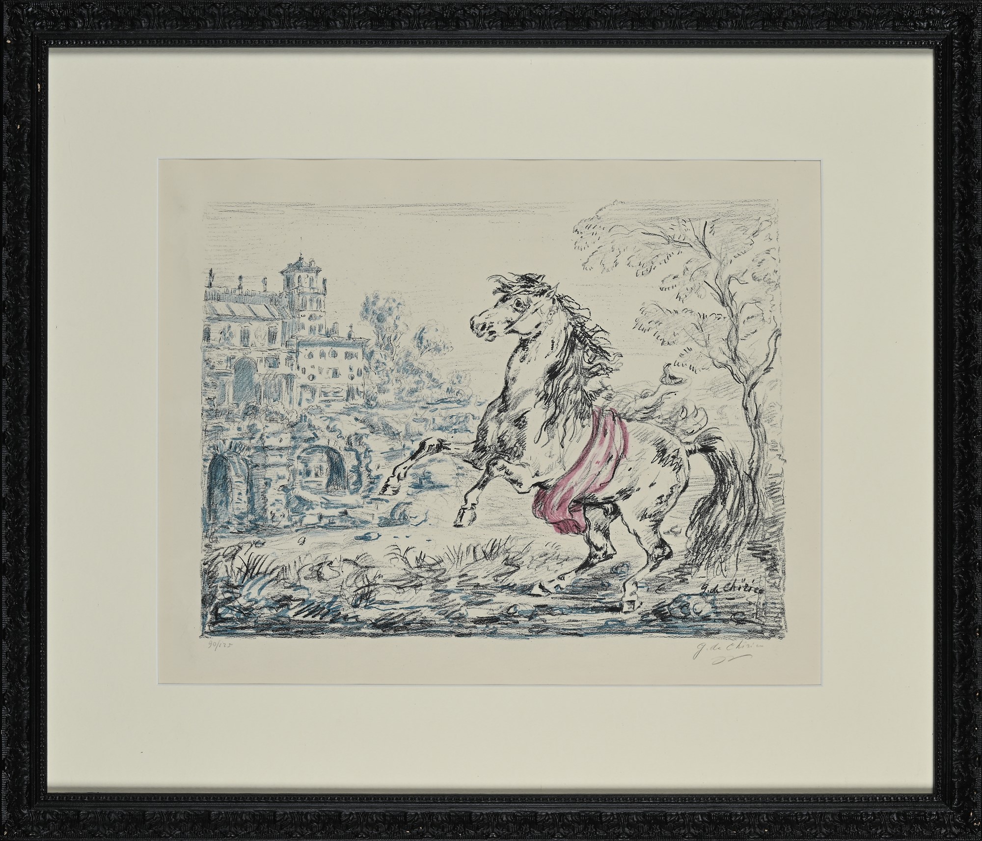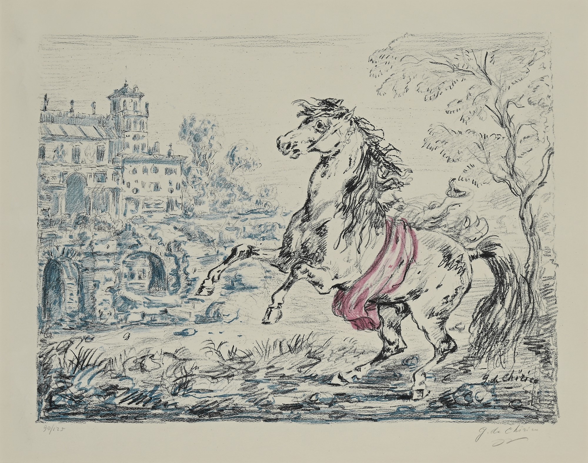Cavallo e castello 1954 Litografia cm 60x50 - in cornice cm 60x70 Firma e numerazione "G. De Chirico 90/125" G. De Chirico, Catalogo dell'opera Grafica 1921-1969, n. 127