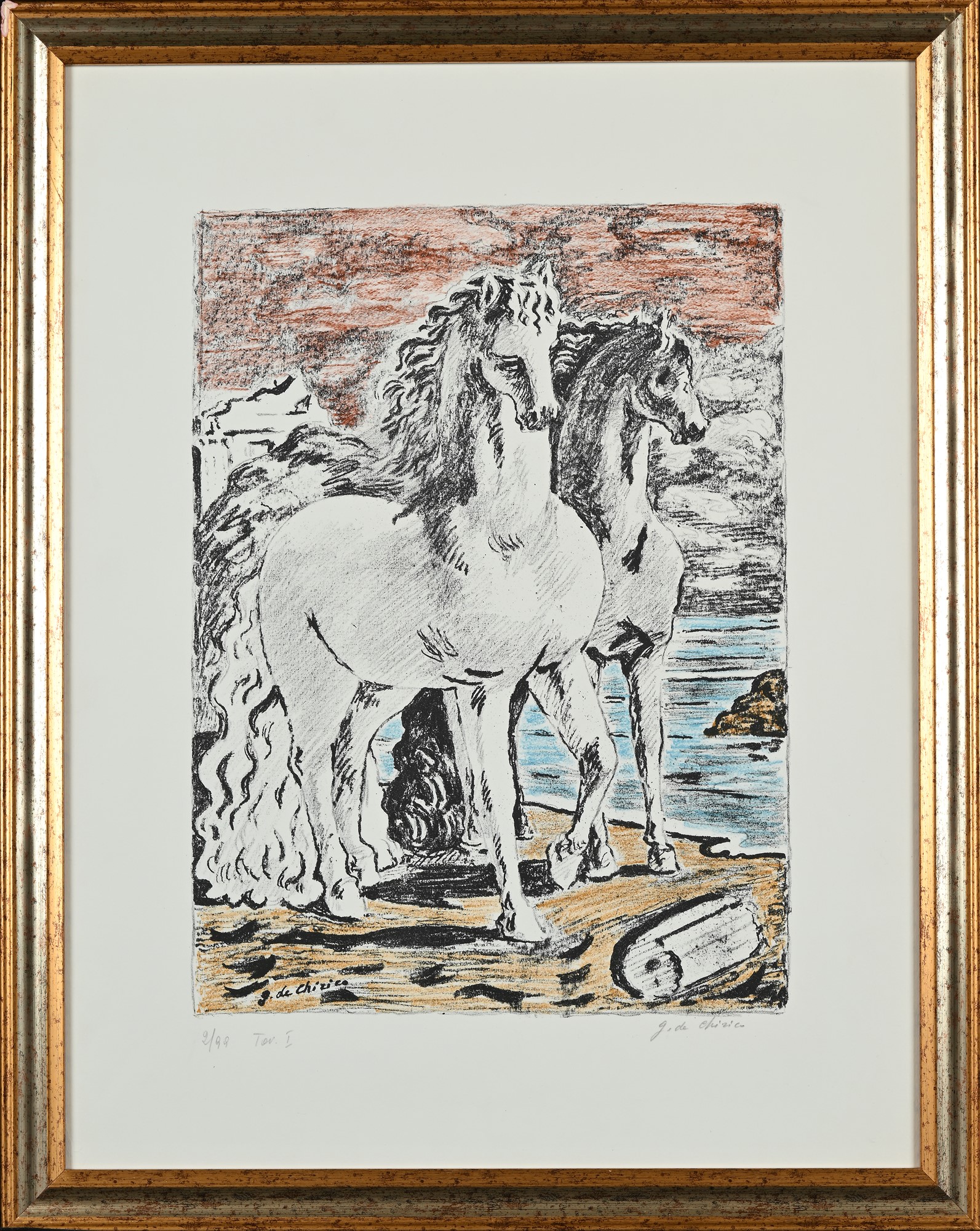 Cavalli antichi 1966 Litografia cm 67x52 - in cornice cm 70x56 Firma e numerazione "G. De Chirico 2/99 tav. 1" G. De Chirico, Catalogo dell'opera grafica 1921-1969, pag. 153 n. 132