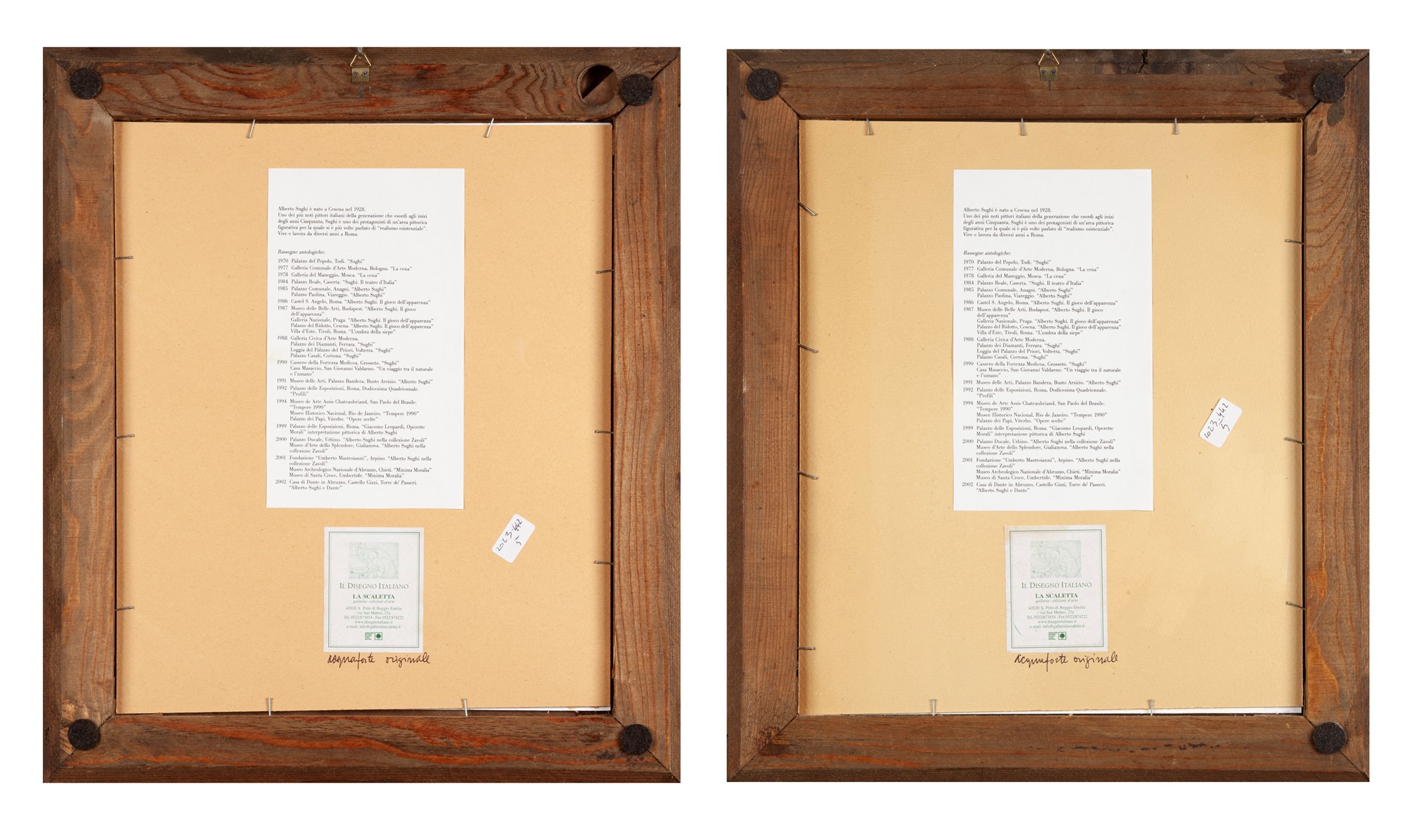 Lotto di due acquaforti Lotto di due acquaforti di Sughi, cm 17x17 (lastra) l'una, in cornice cm 44x39 l'una. Entrambe firmate e numerate rispettivamente "Sughi 47/150", "Sughi 48/150". Entrambe al verso recano etichetta de La Scaletta