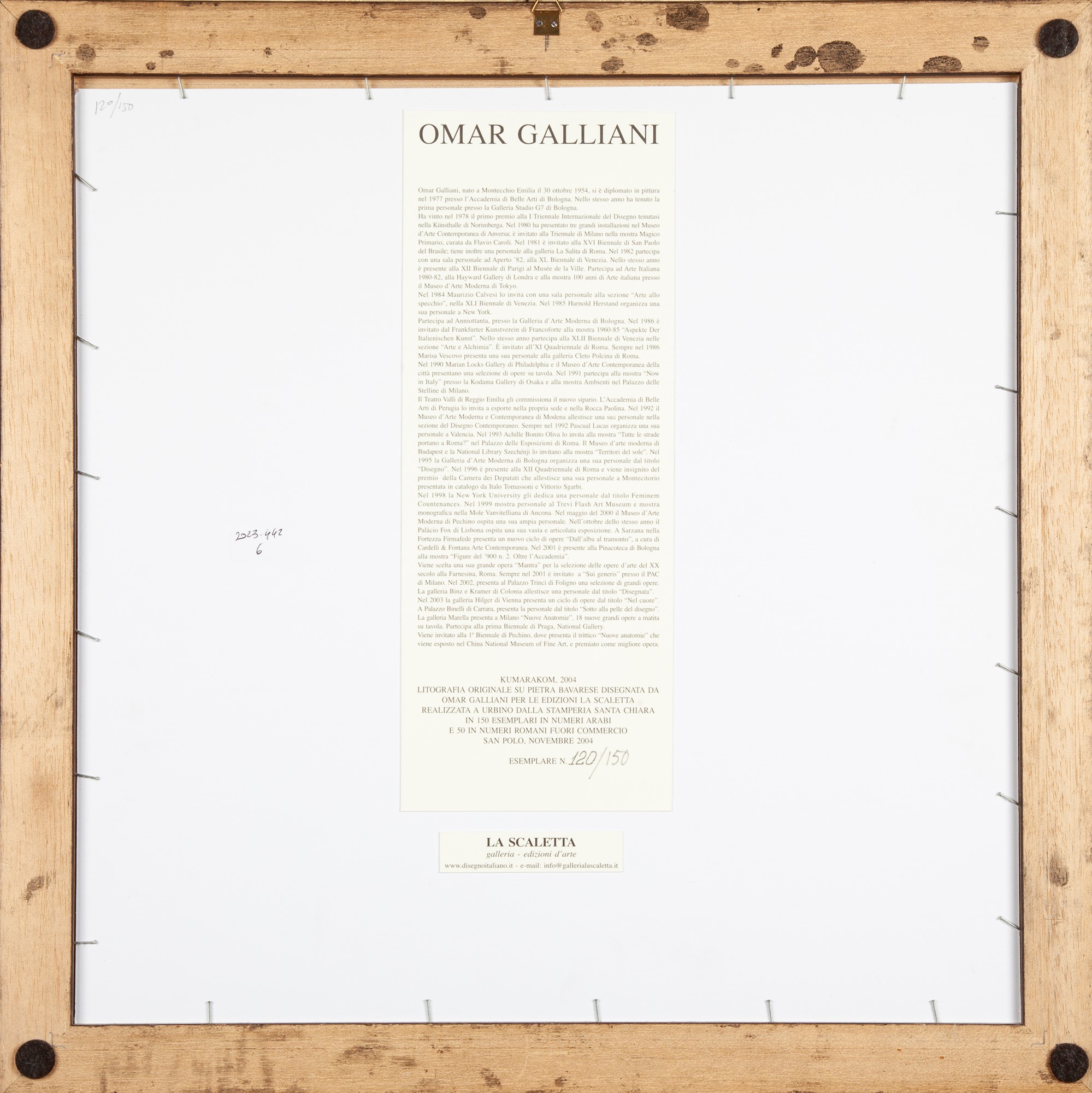 Kumarakom 2004 Litografia cm 30x30 - in cornice cm 52x52 Firma e numerazione "Omar Galliani 120/150". Al verso reca cartiglio de La Scaletta, con giustificativo della numerazione