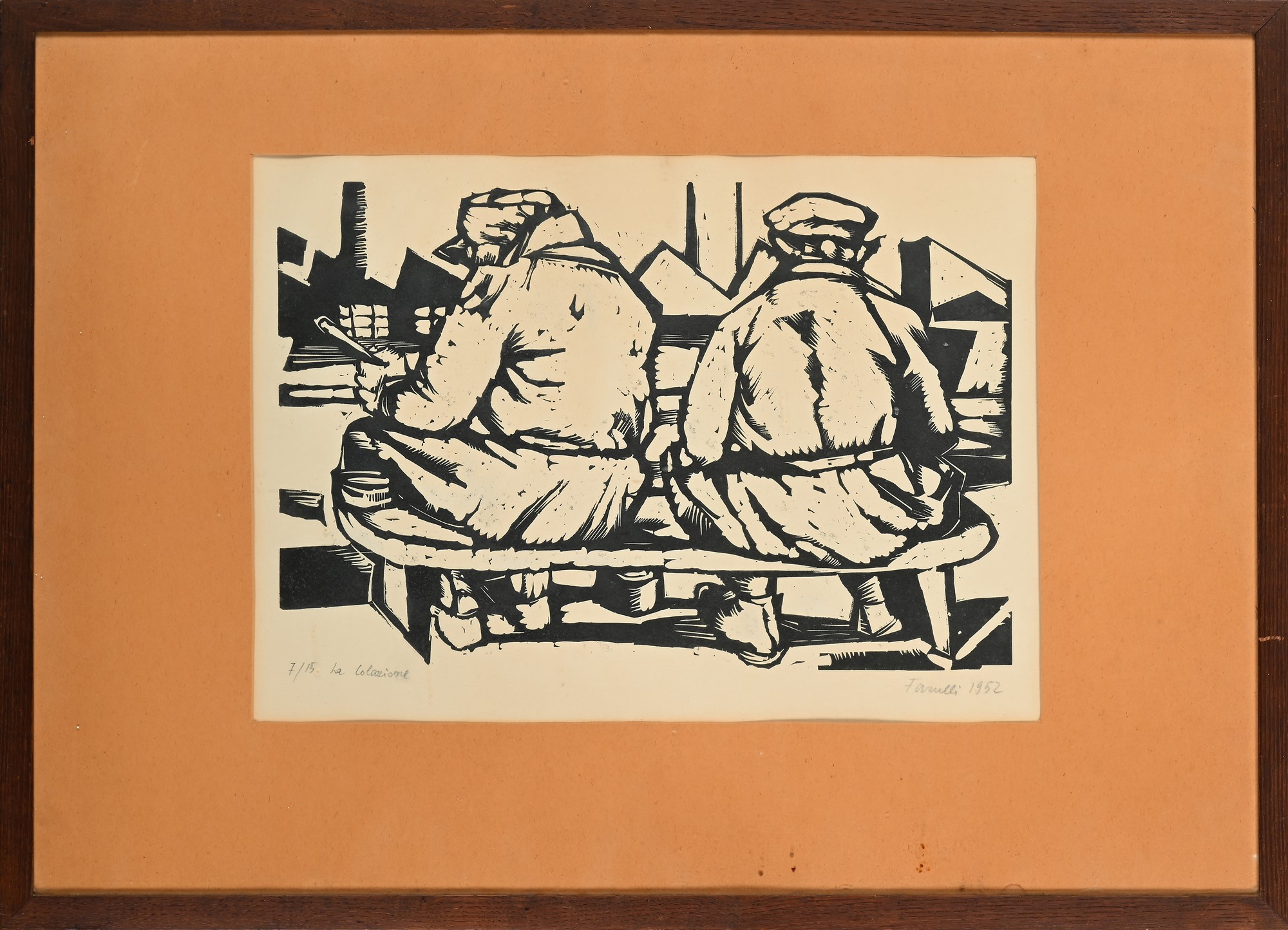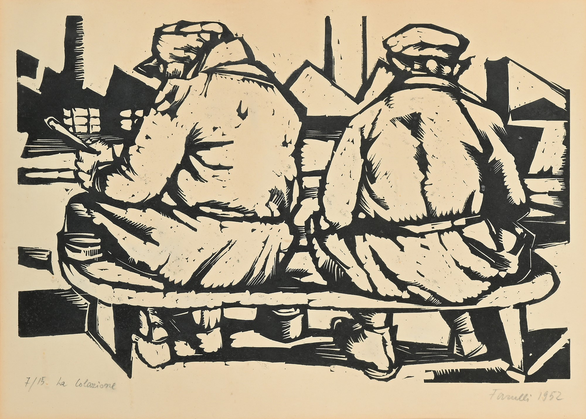La colazione 1952 Xilografia cm 32x45 - in cornice cm 53x74 Firma, data, titolo e numerazione sul fronte in basso "Farulli 1952, La Colazione, 7/15"